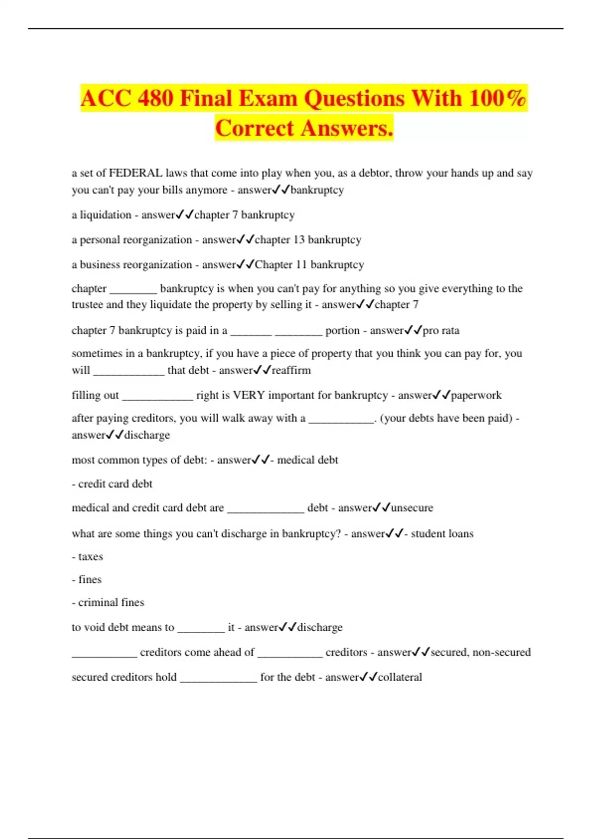 ACC 480 Final Exam Questions With 100% Correct Answers. a set of FEDERAL laws that come into play when you, as a debtor, throw your hands up and say you can't pay your bills anymore - answerbankruptcy a liquidation - answerchapter 7 bankruptcy a personal reorganization - answerchapter 13 bankruptcy a business reorganization - answerChapter 11 bankruptcy chapter ________ bankruptcy is when you can't pay for anything so you give everything to the trustee and they liquidate the property by selling it - answerchapter 7 chapter 7 bankruptcy is paid in a _______ ________ portion - answerpro rata sometimes in a bankruptcy, if you have a piece of property that you think you can pay for, you will ____________ that debt - answerreaffirm filling out ____________ right is VERY important for bankruptcy - answerpaperwork after paying creditors, you will walk away with a ___________. (your debts have been paid) - answerdischarge most common types of debt: - answer- medical debt - credit card debt medical and credit card debt are _____________ debt - answerunsecure what are some things you can't discharge in bankruptcy? - answer- student loans - taxes - fines - criminal fines to void debt means to ________ it - answerdischarge ___________ creditors come ahead of ___________ creditors - answersecured, non-secured secured creditors hold _____________ for the debt - answercollateral