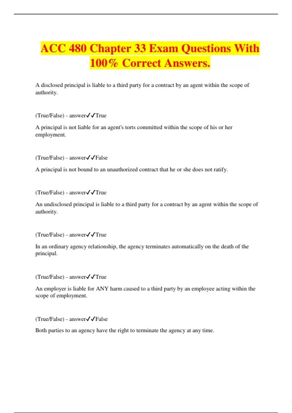 ACC 480 Chapter 33 Exam Questions With 100% Correct Answers. A disclosed principal is liable to a third party for a contract by an agent within the scope of authority. (True/False) - answerTrue A principal is not liable for an agent's torts committed within the scope of his or her employment. (True/False) - answerFalse A principal is not bound to an unauthorized contract that he or she does not ratify. (True/False) - answerTrue An undisclosed principal is liable to a third party for a contract by an agent within the scope of authority. (True/False) - answerTrue In an ordinary agency relationship, the agency terminates automatically on the death of the principal. (True/False) - answerTrue An employer is liable for ANY harm caused to a third party by an employee acting within the scope of employment. (True/False) - answerFalse Both parties to an agency have the right to terminate the agency at any time.
