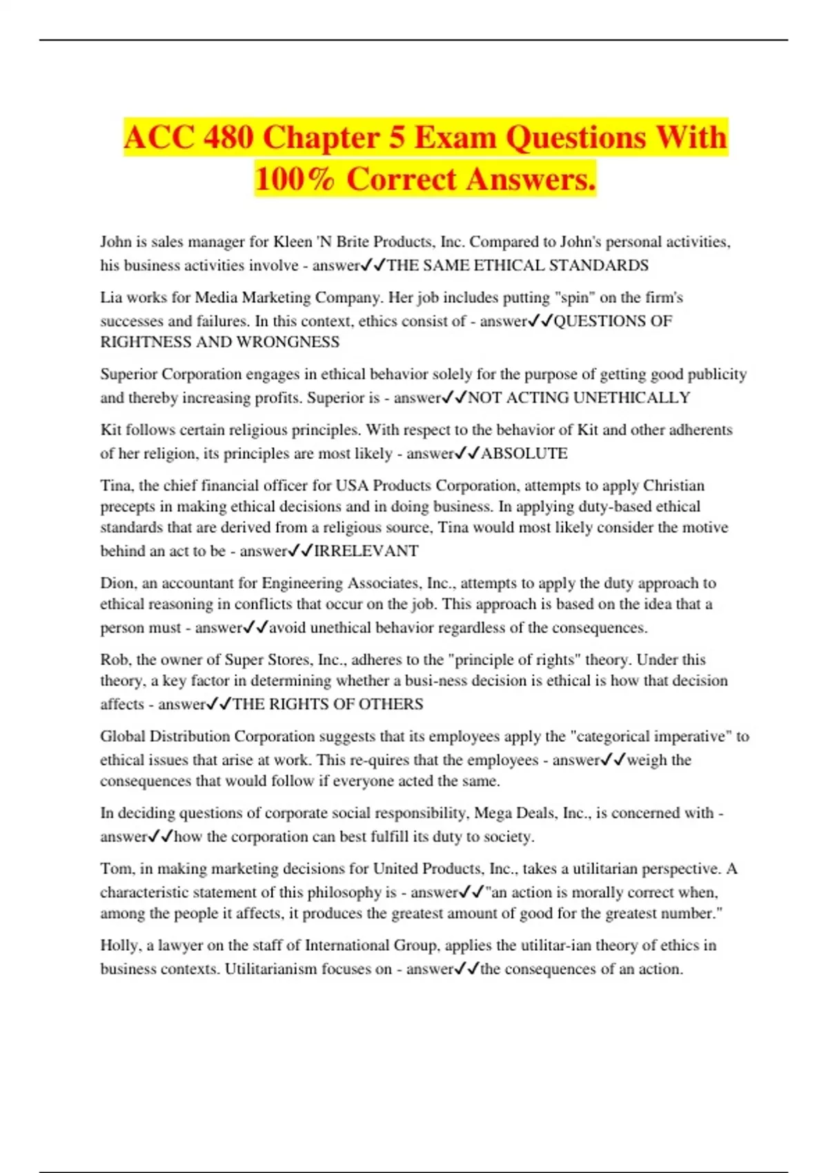ACC 480 Chapter 5 Exam Questions With 100% Correct Answers. John is sales manager for Kleen 'N Brite Products, Inc. Compared to John's personal activities, his business activities involve - answerTHE SAME ETHICAL STANDARDS Lia works for Media Marketing Company. Her job includes putting "spin" on the firm's successes and failures. In this context, ethics consist of - answerQUESTIONS OF RIGHTNESS AND WRONGNESS Superior Corporation engages in ethical behavior solely for the purpose of getting good publicity and thereby increasing profits. Superior is - answerNOT ACTING UNETHICALLY Kit follows certain religious principles. With respect to the behavior of Kit and other adherents of her religion, its principles are most likely - answerABSOLUTE Tina, the chief financial officer for USA Products Corporation, attempts to apply Christian precepts in making ethical decisions and in doing business. In applying duty-based ethical standards that are derived from a religious source, Tina would most likely consider the motive behind an act to be - answerIRRELEVANT Dion, an accountant for Engineering Associates, Inc., attempts to apply the duty approach to ethical reasoning in conflicts that occur on the job. This approach is based on the idea that a person must - answeravoid unethical behavior regardless of the consequences