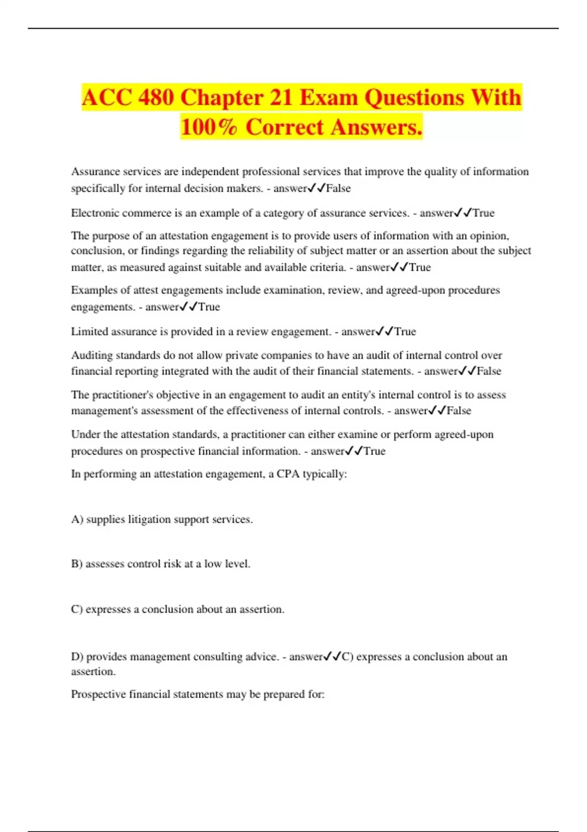 ACC 480 Chapter 21 Exam Questions With 100% Correct Answers. Assurance services are independent professional services that improve the quality of information specifically for internal decision makers. - answerFalse Electronic commerce is an example of a category of assurance services. - answerTrue The purpose of an attestation engagement is to provide users of information with an opinion, conclusion, or findings regarding the reliability of subject matter or an assertion about the subject matter, as measured against suitable and available criteria. - answerTrue Examples of attest engagements include examination, review, and agreed-upon procedures engagements. - answerTrue Limited assurance is provided in a review engagement. - answerTrue Auditing standards do not allow private companies to have an audit of internal control over financial reporting integrated with the audit of their financial statements. - answerFalse The practitioner's objective in an engagement to audit an entity's internal control is to assess management's assessment of the effectiveness of internal controls. - answerFalse Under the attestation standards, a practitioner can either examine or perform agreed-upon procedures on prospective financial information. - answerTrue In performing an attestation engagement, a CPA typically: A) supplies litigation support services. B) assesses control risk at a low level. C) expresses a conclusion about an assertion. D) provides management consulting advice. - answerC) expresses a conclusion about an assertion. Prospective financial statements may be prepared for: A) only general use. B) only limited use. C) only internal use. D) general, limited, and internal use. - answerD) general, limited, and internal use. Given one or more hypothetical assumptions, a responsible party may prepare, to the best of his knowledge and belief, an entity's expected financial position, results of operations, and changes in cash flows. Such prospective financial statements are known as: A) pro forma financial statements. B) financial projections. C) partial presentations. D) financial forecasts. - answerB) financial projections. Which of the following are prospective financial statements upon which an accountant may appropriately report for general use? A) Pro forma financial statements. B) Financial projections. C) Partial presentations. D) Financial forecasts. - answerD) Financial forecasts. Accepting an engagement to examine an entity's financial projections would most likely be appropriate if distribution of the projections were limited to: A) the general public on the entity's website. B) potential stockholders who request a prospectus or a registration statement. C) a bank with which the entity is negotiating for a loan. D) all stockholders of record as of the report date. - answerC) a bank with which the entity is negotiating for a loan. An examination of a financial forecast is a professional service that involves: A) compiling or assembling a financial forecast that is based on management's assumptions. B) limiting the distribution of the accountant's report to management and the board of directors. C) assuming responsibility to update management on key events for one year after the report's date. D) evaluating whether the computations of prospective amounts are mathematically accurate and assumptions are internally consistent. - answerD) evaluating whether the computations of prospective amounts are mathematically accurate and assumptions are internally consistent. Limited assurance is provided in: A) an audit engagement. B) a compilation engagement. C) a review engagement. D) none of the items listed. - answerC) a review engagement. Absolute assurance is provid