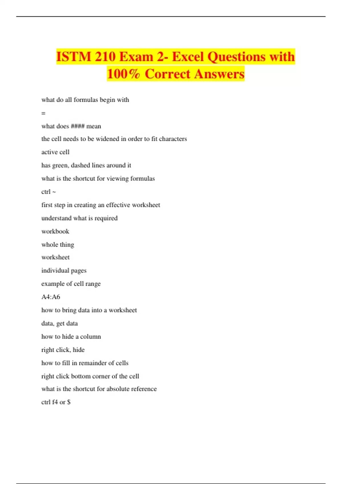 ISTM 210 Exam 2- Excel Questions with 100% Correct Answers what do all formulas begin with = what does #### mean the cell needs to be widened in order to fit characters active cell has green, dashed lines around it what is the shortcut for viewing formulas ctrl ~ first step in creating an effective worksheet understand what is required workbook whole thing worksheet individual pages example of cell range A4:A6 how to bring data into a worksheet data, get data how to hide a column right click, hide how to fill in remainder of cells right click bottom corner of the cell what is the shortcut for absolute reference ctrl f4 or $