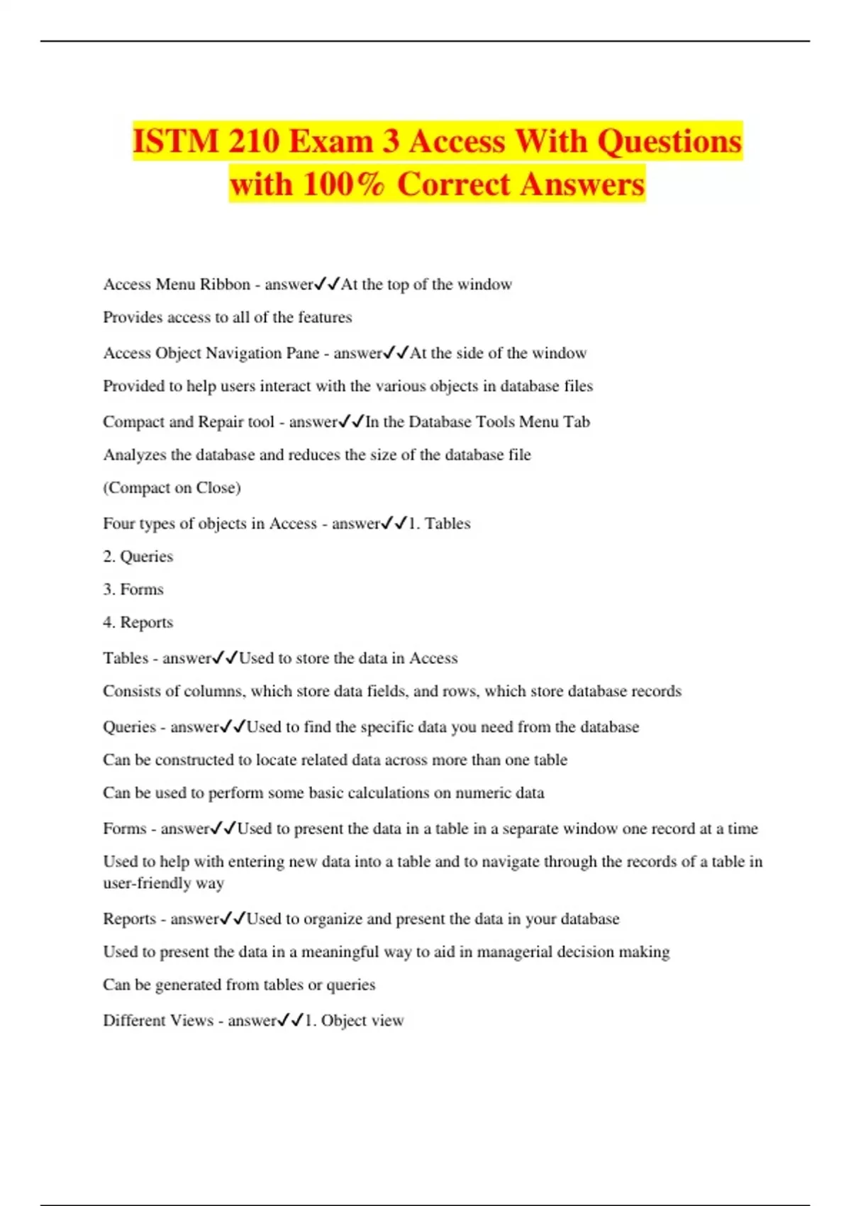ISTM 210 Exam 3 Access With Questions with 100% Correct Answers Access Menu Ribbon - answerAt the top of the window Provides access to all of the features Access Object Navigation Pane - answerAt the side of the window Provided to help users interact with the various objects in database files Compact and Repair tool - answerIn the Database Tools Menu Tab Analyzes the database and reduces the size of the database file (Compact on Close) Four types of objects in Access - answer1. Tables 2. Queries 3. Forms 4. Reports Tables - answerUsed to store the data in Access Consists of columns, which store data fields, and rows, which store database records Queries - answerUsed to find the specific data you need from the database Can be constructed to locate related data across more than one table Can be used to perform some basic calculations on numeric data Forms - answerUsed to present the data in a table in a separate window one record at a time Used to help with entering new data into a table and to navigate through the records of a table in user-friendly way Reports - answerUsed to organize and present the data in your database Used to present the data in a meaningful way to aid in managerial decision making Can be generated from tables or queries Different Views - answer1. Object view 2. Design View 3. Layout View Object View - answerDisplays the finished object (Maybe a finished table) Design View - answerUsed to edit the object Allows you to add and configure the field in a table Allows you to add elements to the form or report and change the appearance of those elements Layout View - answerLike the design view, but provides fewer options for manipulating the object Often easier to use than the design view Not always an option to use Relation - answerTechnical term for a table Is the basis of the term "Relational Database" Relationship - answerWhen a table contains data associated with data from another table within the database Entity - answerSomething you are collecting data on Attribute - answerData stored for each database record Record - answerRow in the table All the information you have about specific instances of an entity Field - answerColumn in the table All information you have of an attribute Prometheus approach to creating tables - answerTable Design Naming fields - answer1. Should be meaningful and descriptive 2. Allows you to use spaces, but not recommended 3. Use only letters and numbers, no symbols or special letters Data types for fields - answer1. Short Text (up to 255 characters) 2. Long Text (up to 65,536 characters) 3. Number (positive or negative)