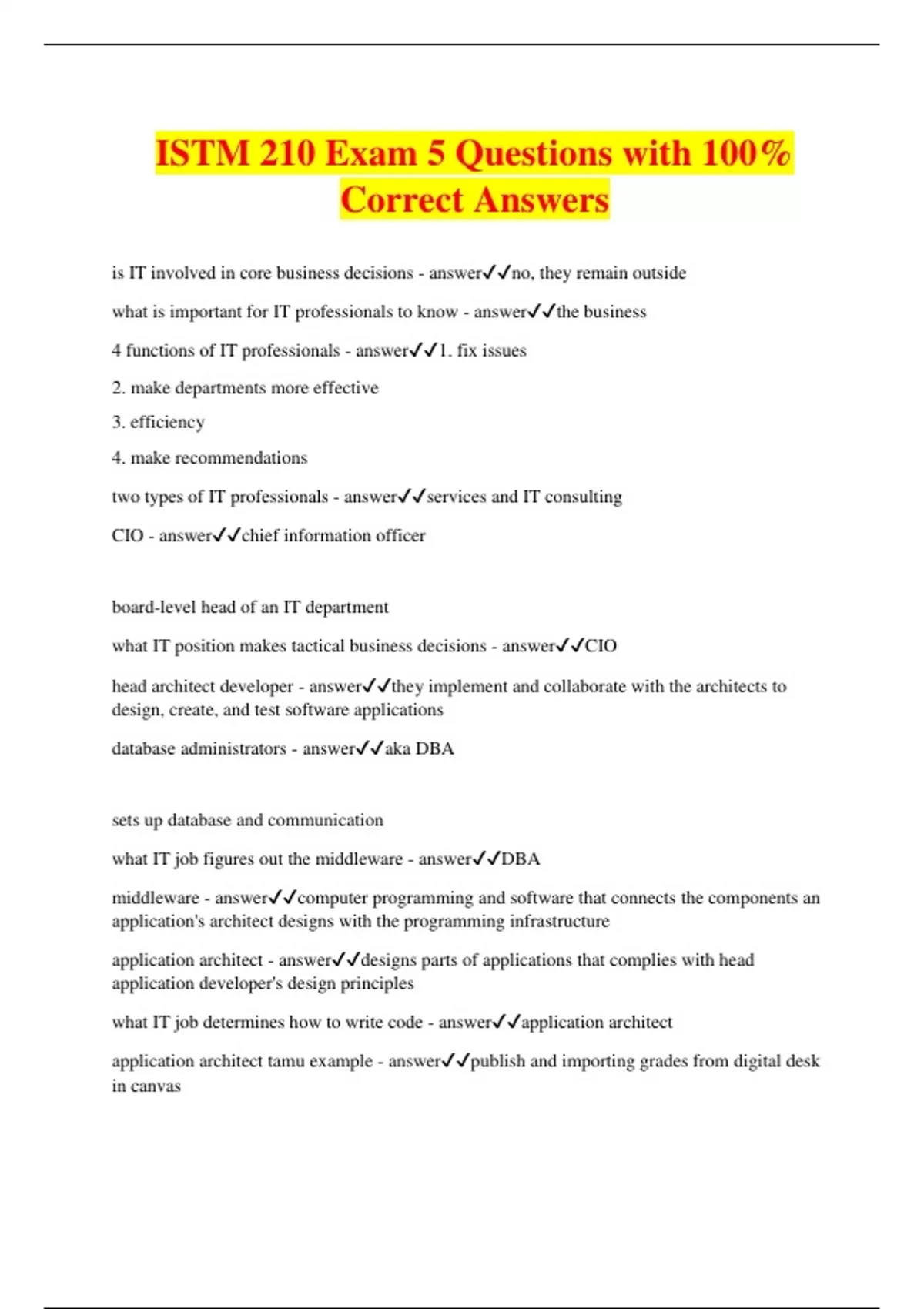 ISTM 210 Exam 5 Questions with 100% Correct Answers is IT involved in core business decisions - answerno, they remain outside what is important for IT professionals to know - answerthe business 4 functions of IT professionals - answer1. fix issues 2. make departments more effective 3. efficiency 4. make recommendations two types of IT professionals - answerservices and IT consulting CIO - answerchief information officer board-level head of an IT department what IT position makes tactical business decisions - answerCIO head architect developer - answerthey implement and collaborate with the architects to design, create, and test software applications database administrators - answeraka DBA sets up database and communication what IT job figures out the middleware - answerDBA middleware - answercomputer programming and software that connects the components an application's architect designs with the programming infrastructure application architect - answerdesigns parts of applications that complies with head application developer's design principles what IT job determines how to write code - answerapplication architect application architect tamu example - answerpublish and importing grades from digital desk in canvas digital desk - answerconsidered an outside system IT auditor - answermakes sure everyone in a business follows the rules, regulations, and guidelines network administrator - answerresponsible for the smooth operations of a business' networks (hardware and software) what 4 things does a network admin makes sure a network has - answer1. a large network 2. bandwidth 3. servers 4. accounts IT consultant - answerconduit between IT and the rest of the organization what does ERP stand for - answerenterprise resource planning what is ERP - answercomputer system used to administer or organize resources or info that allows different departments to communicate and collaborate what was the first ERP - answerSAP, made in Germany what are the advantages of ERP - answer1. back office 2. efficient 3. integrated 4. detailed reports 5. analyze and make changed 6. provides security unique authorization - answeronly gives access to certain people advantage of ERP what are the disadvantages of ERP - answer1. glitches 2. hard to change once its implemented 3. cost 4. always have to train people 5. very little customization