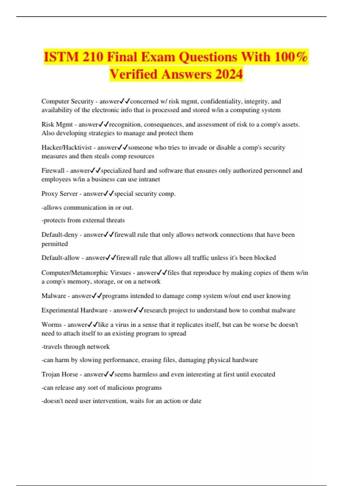 ISTM 210 Final Exam Questions With 100% Verified Answers 2024 Computer Security - answerconcerned w/ risk mgmt, confidentiality, integrity, and availability of the electronic info that is processed and stored w/in a computing system Risk Mgmt - answerrecognition, consequences, and assessment of risk to a comp's assets. Also developing strategies to manage and protect them Hacker/Hacktivist - answersomeone who tries to invade or disable a comp's security measures and then steals comp resources Firewall - answerspecialized hard and software that ensures only authorized personnel and employees w/in a business can use intranet Proxy Server - answerspecial security comp. -allows communication in or out. -protects from external threats Default-deny - answerfirewall rule that only allows network connections that have been permitted Default-allow - answerfirewall rule that allows all traffic unless it's been blocked Computer/Metamorphic Virsues - answerfiles that reproduce by making copies of them w/in a comp's memory, storage, or on a network Malware - answerprograms intended to damage comp system w/out end user knowing Experimental Hardware - answerresearch project to understand how to combat malware Worms - answerlike a virus in a sense that it replicates itself, but can be worse bc doesn't need to attach itself to an existing program to spread -travels through network -can harm by slowing performance, erasing files, damaging physical hardware Trojan Horse - answerseems harmless and even interesting at first until executed -can release any sort of malicious programs -doesn't need user intervention, waits for an action or date Spyware - answercomp program installed to capture or take control of a system w/user knowledge or consent -monitors key strokes -installs new software Adware - answeradvertising supported software. Irritating bc not malicious -from internet w/out user intervention -adware programmers motivated for economic reasons Spamming - answerabuse of email system to send millions of bulk -advertising, chain letters, criminal schemes -faxes, phones, blogs, newsgroups are also prey Denial of Service Attack - answerattempt to make a comp or any of its resources unavailable to intended users -form of malicious program downloaded as email attachment -requires huge amt of processing power -targets larger things like a network, website, software -slow bc extra computing cycles being used up -Estonia Reverse Phishing - answerwhen perpetrator logs onto a comp and installs program that key logs -newer malware -catches sensitive info Malware solutions - answer-anti-virus software. helps identify, prevent, and eliminate comp viruses and malware -back things up 2 Popular Anti-Viruses - answer-Symantec Corp's Norton Antivirus -McAfee's virus scan (Intel) Internet Fraud - answerany fraudulent activity online Internet Fraud can happen through - answer-email systems -message boards -chat rooms -websites Click Fraud - answerEverytime someone clicks on an ad, they get money -Ex. google adsense Purchase Scams - answerInvolve a buyer that approaches merchants via spam and asks to pay for their shipping with credit card -most uncomplicated type of internet fraud Phishing - answercriminal activity involving social engineer techniques to gain private info -paypal and ebay are common target Advantage of Cookies - answer-don't have to retype info -experience is easier Disadvantage of Cookies - answer-used for tracking website behavior -owner of website knows your browsing habits History Files - answerlist of stored or cached websites on a user's comp that are an account of where and what a user's web browser has visited Identity Theft - answercrime concerning unlawful practice of assuming another's identity for economic gain -just need SSN Shoulder Surfing - answercriminal in public place that looks over victim's shoulder to watch them type sensitive info -ex. typing pin # at ATM Dumpster Diving - answerthrown out and not shredded SCAM - answer-Stingy about giving out sensitive info -Check financial info on regular basis and inspect for anything odd -Ask periodically for credit report -Maintain records of banking and financing CAN-SPAM - answerrules made for people when sending spam mail Sting Ray - answeracts like a cell tower and intercepts phone calls