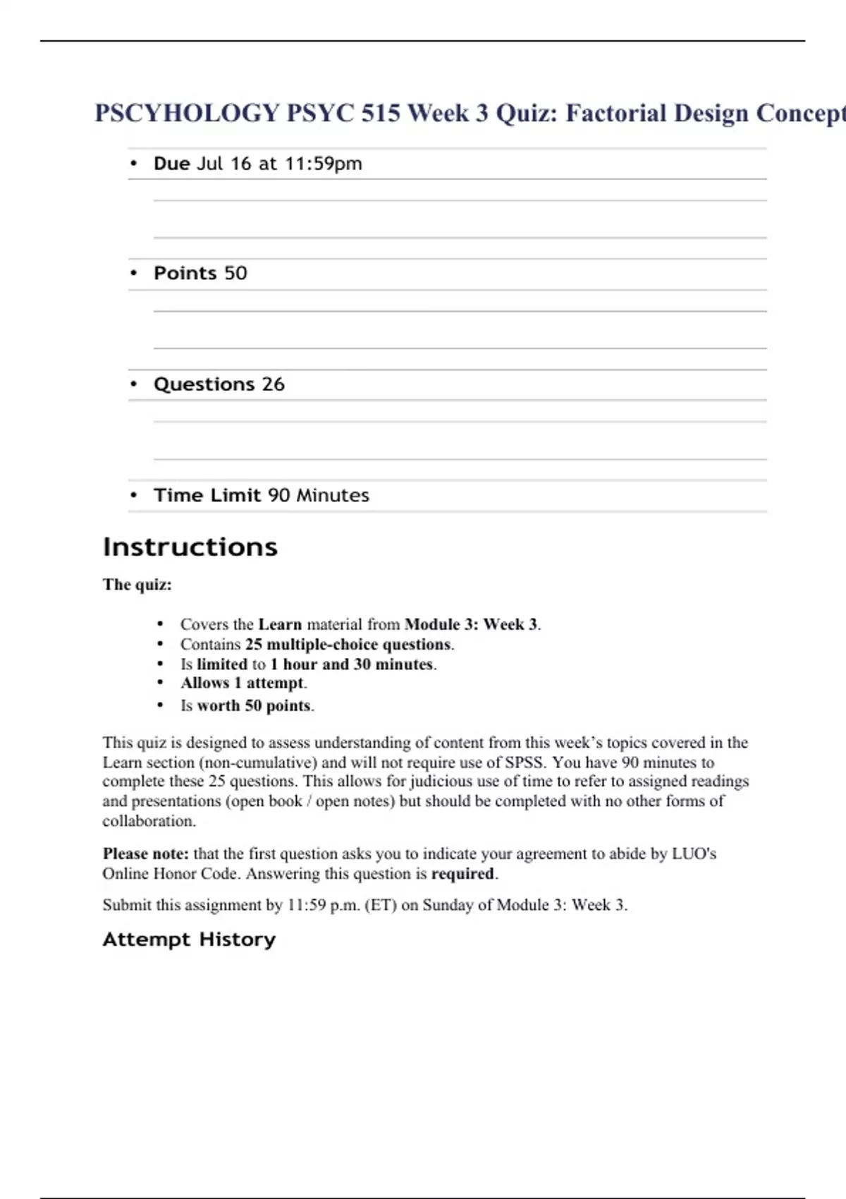PSCYHOLOGY PSYC 515 Week 3 Quiz: Factorial Design Concepts. • Due Jul 16 at 11:59pm • Points 50 • Questions 26 • Time Limit 90 Minutes Instructions The quiz: • Covers the Learn material from Module 3: Week 3. • Contains 25 multiple-choice questions. • Is limited to 1 hour and 30 minutes. • Allows 1 attempt. • Is worth 50 points. This quiz is designed to assess understanding of content from this week’s topics covered in the Learn section (non-cumulative) and will not require use of SPSS. You have 90 minutes to complete these 25 questions. This allows for judicious use of time to refer to assigned readings and presentations (open book / open notes) but should be completed with no other forms of collaboration. Please note: that the first question asks you to indicate your agreement to abide by LUO's Online Honor Code. Answering this question is required. Submit this assignment by 11:59 p.m. (ET) on Sunday of Module 3: Week 3. Attempt History Attempt Time Score LATEST Attempt 1 33 minutes 50 out of 50 Correct answers are hidden. Score for this quiz: 50 out of 50 Submitted Jul 10 at 4:35am This attempt took 33 minutes. I have read and understand the Academic Honor policy as outlined in the Online Honor Code for Liberty University Online. I agree to abide by this policy and that the work submitted herein is my own. Yes No In a study examining the effects of gender (male or female) and major (psychology, computer science, philosophy, or biology) on college students’ willingness to perform community service work, how many main effects are possible? 3 6 5 2 In a study examining the effects of gender (male or female) and major (psychology, philosophy, or biology) on college students’ willingness to perform community service work, what is the factorial notation? 2 x 2 2 x 4 1 x 6 2 x 3 A factorial design involves measuring more than one dependent factor (variables). both measuring more than one dependent factor (variables) AND manipulating more than one independent factor (variable). none of the options are correct manipulating more than one independent factor (variable). For a 2 x 4 factorial design, there is the possibility of main effect(s) and interaction effect(s). 2; 1 4; 8 8; 8 2; 4 A 3 x 3 x 3 x 3 design has potential main effects. 4 3 81 12 In a study examining the effects of gender (male or female) and major (psychology, computer science, philosophy, or biology) on college students’ willingness to perform community service work, how many interaction effects are possible? 5 1 2 6 In a study examining the effects of time of day (morning or afternoon) and temperature (cool, normal, warm) on worker productivity, the factorial notation would be 2 x 2 2 x 5 1 x 6