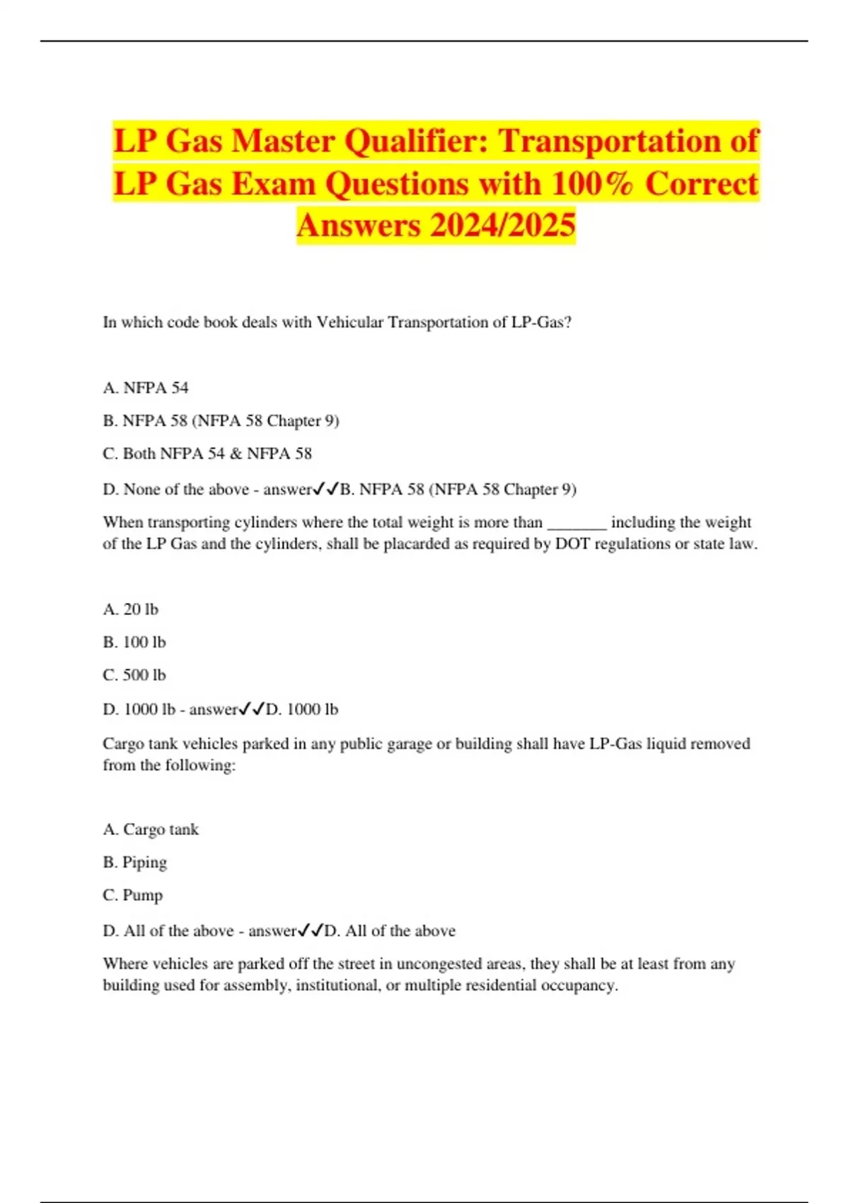 LP Gas Master Qualifier: Transportation of LP Gas Exam Questions with 100% Correct Answers 2024/2025 In which code book deals with Vehicular Transportation of LP-Gas? A. NFPA 54 B. NFPA 58 (NFPA 58 Chapter 9) C. Both NFPA 54 & NFPA 58 D. None of the above - answerB. NFPA 58 (NFPA 58 Chapter 9) When transporting cylinders where the total weight is more than _______ including the weight of the LP Gas and the cylinders, shall be placarded as required by DOT regulations or state law. A. 20 lb B. 100 lb C. 500 lb D. 1000 lb - answerD. 1000 lb Cargo tank vehicles parked in any public garage or building shall have LP-Gas liquid removed from the following: A. Cargo tank B. Piping C. Pump D. All of the above - answerD. All of the above Where vehicles are parked off the street in uncongested areas, they shall be at least from any building used for assembly, institutional, or multiple residential occupancy.
