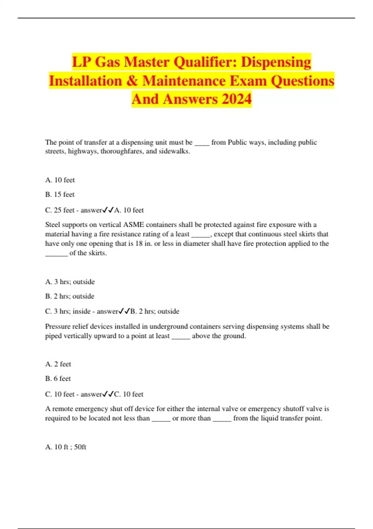 LP Gas Master Qualifier: Dispensing Installation & Maintenance Exam Questions And Answers 2024 The point of transfer at a dispensing unit must be ____ from Public ways, including public streets, highways, thoroughfares, and sidewalks. A. 10 feet B. 15 feet C. 25 feet - answerA. 10 feet Steel supports on vertical ASME containers shall be protected against fire exposure with a material having a fire resistance rating of a least _____, except that continuous steel skirts that have only one opening that is 18 in. or less in diameter shall have fire protection applied to the ______ of the skirts. A. 3 hrs; outside B. 2 hrs; outside C. 3 hrs; inside - answerB. 2 hrs; outside Pressure relief devices installed in underground containers serving dispensing systems shall be piped vertically upward to a point at least _____ above the ground. A. 2 feet B. 6 feet C. 10 feet - answerC. 10 feet A remote emergency shut off device for either the internal valve or emergency shutoff valve is required to be located not less than _____ or more than _____ from the liquid transfer point. A. 10 ft ; 50ft