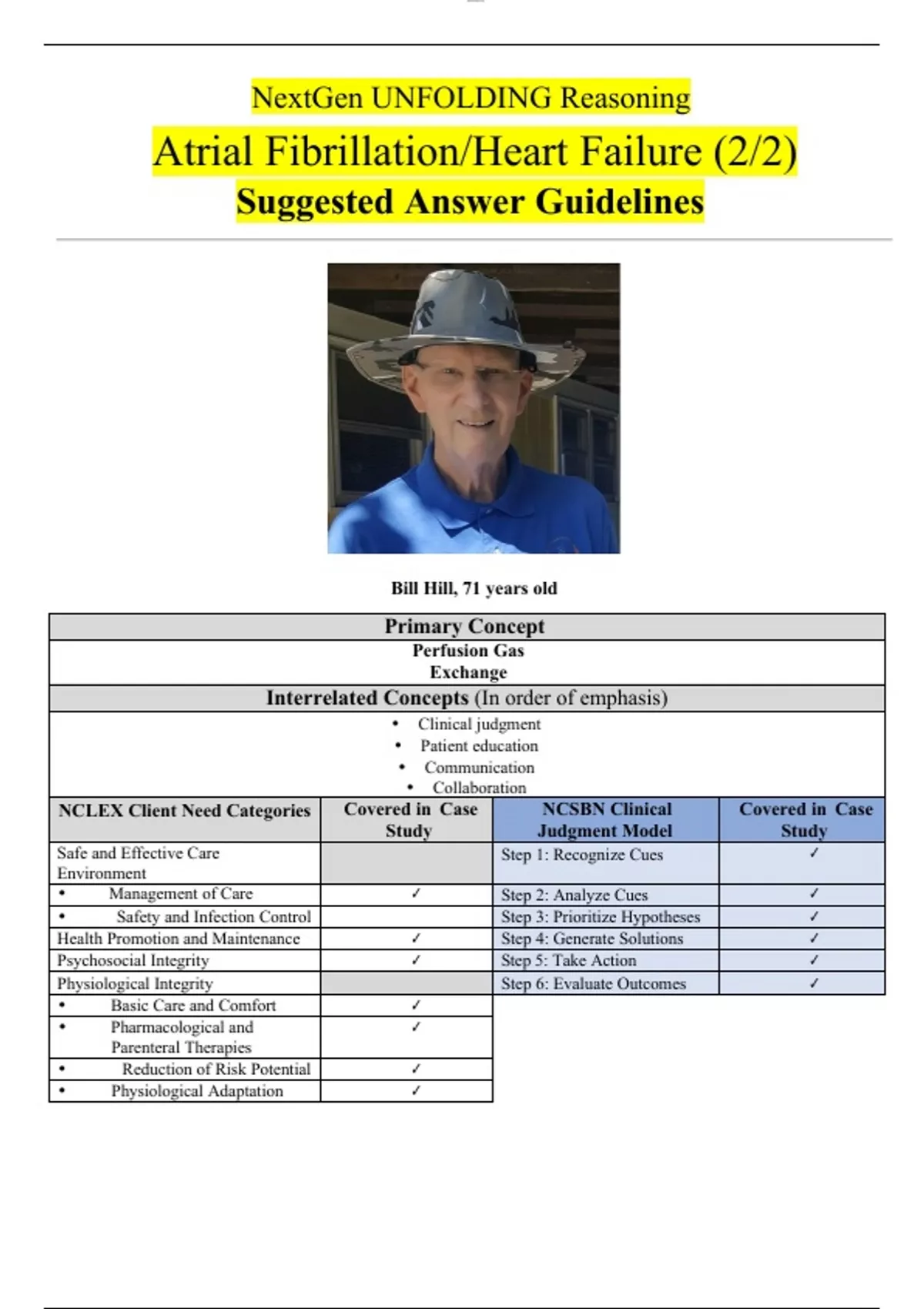 NextGen UNFOLDING Reasoning Atrial Fibrillation/Heart Failure (2/2) Suggested Answer Guidelines Bill Hill, 71 years old Primary Concept Perfusion Gas Exchange Interrelated Concepts (In order of emphasis) • Clinical judgment • Patient education • Communication • Collaboration NCLEX Client Need Categories Covered in Case Study NCSBN Clinical Judgment Model Covered in Case Study Safe and Effective Care Environment Step 1: Recognize Cues • Management of Care Step 2: Analyze Cues • Safety and Infection Control Step 3: Prioritize Hypotheses Health Promotion and Maintenance Step 4: Generate Solutions Psychosocial Integrity Step 5: Take Action Physiological Integrity Step 6: Evaluate Outcomes • Basic Care and Comfort • Pharmacological and Parenteral Therapies • Reduction of Risk Potential • Physiological Adaptation Present Problem: Part I: Initial Nursing Assessment Bill Hill is a 71-year old male with a past medical history of benign prostatic hyperplasia (BPH), peripheral vascular disease and myelodysplastic syndrome two months ago after a bone marrow biopsy. Six weeks ago Bill was admitted because he had a syncopal episode. He was diagnosed with paroxysmal atrial fibrillation and acute anemia with a Hgb of 6.9 and received a transfusion of one unit of PRBCs. Bill presents to the emergency department today with increasing weakness, fatigue, sinus congestion, fever, and chills the past week. He was around grandchildren with colds two weeks ago. Bill woke up at 6 am today feeling short of breath, harsh coughing with clear sputum. He had difficulty walking back to bed after getting up to the bathroom. His wife who is a retired nurse noted that he was much more pale, took his vital signs, which were BP: 96/62, HR: 140 irreg, RR: 24. Bill admits to losing 15 lb (6.8 kg) over the last 2-3 months. Personal/Social History: Mr. Hill is retired and lives at home with his wife in a rural area. His two adult children live out of state. He has been an active, healthy male who enjoys gardening, hunting, and splits wood to heat his home in the winter. Since he has been dealing with changes in his health he has not been able to participate in these activities as much. In the past, he has been employed as a minister who has a strong Christian faith. He denies smoking, alcohol use, and illicit drug us What data from the histories are RELEVANT and must be interpreted as clinically significant by the nurse? (NCSBN: Step 1 Recognize cues/NCLEX Reduction of Risk Potential) RELEVANT Data from Present Problem: Clinical Significance: Myelodysplastic syndrome diagnosed one month ago Diagnosed with paroxysmal atrial fibrillation and acute anemia with a Hgb of 6.9 and received a transfusion of one unit of PRBCs. Bill presents to the emergency department today with increasing weakness, fatigue, sinus congestion, fever, and chills the past week. He was around grandchildren with colds two weeks ago. Bill woke up at 6 am today feeling short of breath, harsh coughing with clear sputum. He had difficulty walking back to bed after getting up to the bathroom. His wife who is a retired nurse noted that he was much more pale and took his vital signs, which were BP: 96/62, HR: 140 irreg, RR: 24. This is a categorical diagnosis, and this patient needs another bone marrow biopsy to obtain a definitive diagnosis, per his oncologist, and treatment plan. Until this happens, the underlying disease is not treated and can contribute to this patient’s symptoms. This recent medical history is relevant to his current presentation. He may again be anemic and be in atrial fibrillation that may be contributing to his current cluster of complaints. Consider the causes: anemia, low BP, dehydraton. What started as a viral infection could progress to more severe lung pathology or secondary infection. When examining patient listen to the lungs for pneumonia, pleural effusion, allergy, infection? What physical findings align? Weakness can indicate an electrolyte imbalance, dehydration, sepsis, and anemia. This raises the concern of a primary infectious source of his current problem. Indicates a problem with the respiratory or cardiac system. will require a thorough assessment of the respiratory and cardiac systems and additional lab and diagnostic work. This degree of weakness is significant and a clinical RED FLAG that indicates the underlying severity of his current cluster of complaints. Being pale could be multifactorial and could include severe anemia and hypotension. His initial vital signs are concerning because his blood pressure is too low, his heart rate is too high and his respiratory rate is too high and causing shortness of breath. Knowing that he has a history of paroxysmal atrial fibrillation, knowing that his heart rate is Bill admits to losing 15 lb (6.8 kg) over the last 2-3 months. this rapid and irregular is a clinical red flag for atrial fibrillation been a contributor a cause to his current problem. Weight loss is more than expected and another clinical RED FLAG that requires further investigation by the nurse. RELEVANT Data from Social History: Clinical Significance: He has been an active, healthy male who enjoys gardening, hunting, and splits wood to heat his home in the winter. Since he has been dealing changes in his health he has not been able to participate in these activities as much. In the past, he has been employed as a minister who has a strong Christian faith. New onset of disease and change in condition for patient and wife.These psychosocial considerations will need to be integrated into the plan of care once he is admitted to the hospital. Identify the psychosocial impact of this change in status upon his overall emotional and mental well-being. This defines the patient’s values and relates to the decisions made by this patient. Consider supporting the patient’s Christian perspective by offering pastoral care. What is the RELATIONSHIP of the past medical history and current medications? Wh