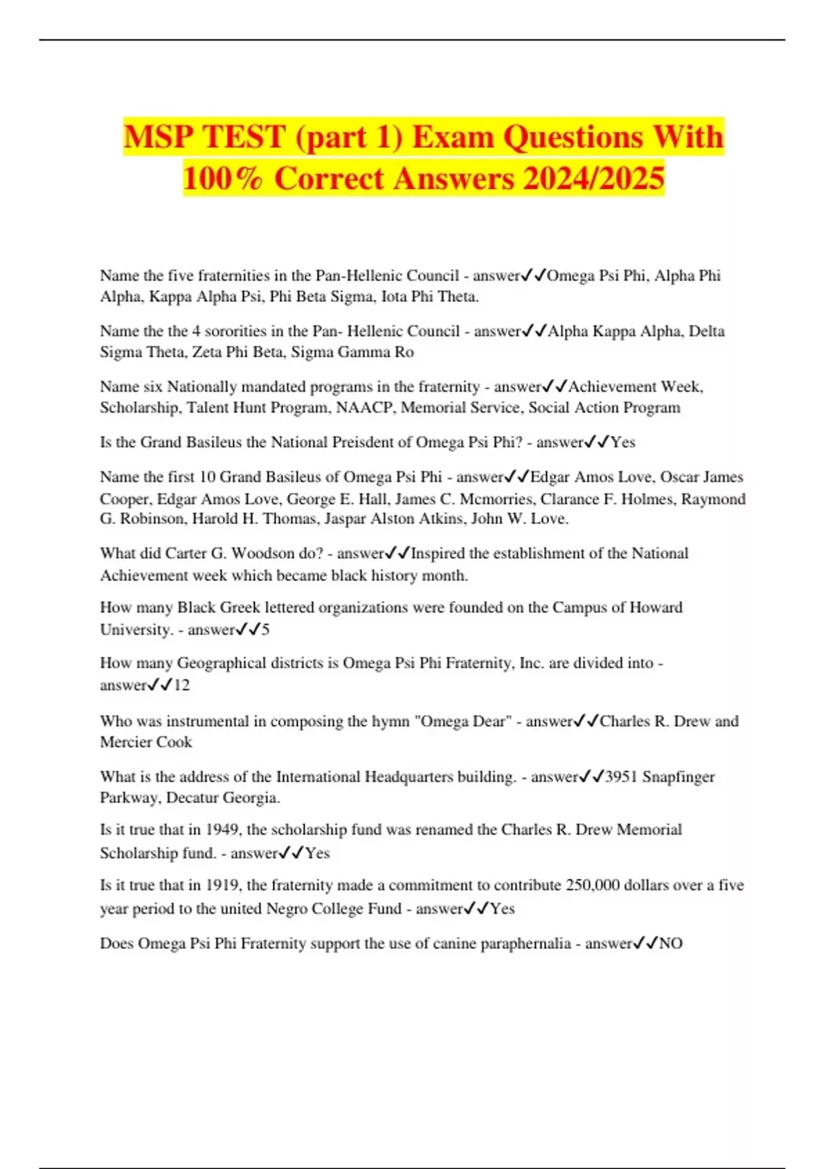 MSP TEST (part 1) Exam Questions With 100% Correct Answers 2024/2025 Name the five fraternities in the Pan-Hellenic Council - answerOmega Psi Phi, Alpha Phi Alpha, Kappa Alpha Psi, Phi Beta Sigma, Iota Phi Theta. Name the the 4 sororities in the Pan- Hellenic Council - answerAlpha Kappa Alpha, Delta Sigma Theta, Zeta Phi Beta, Sigma Gamma Ro Name six Nationally mandated programs in the fraternity - answerAchievement Week, Scholarship, Talent Hunt Program, NAACP, Memorial Service, Social Action Program Is the Grand Basileus the National Preisdent of Omega Psi Phi? - answerYes Name the first 10 Grand Basileus of Omega Psi Phi - answerEdgar Amos Love, Oscar James Cooper, Edgar Amos Love, George E. Hall, James C. Mcmorries, Clarance F. Holmes, Raymond G. Robinson, Harold H. Thomas, Jaspar Alston Atkins, John W. Love. What did Carter G. Woodson do? - answerInspired the establishment of the National Achievement week which became black history month. How many Black Greek lettered organizations were founded on the Campus of Howard University. - answer5 How many Geographical districts is Omega Psi Phi Fraternity, Inc. are divided into - answer12 Who was instrumental in composing the hymn "Omega Dear" - answerCharles R. Drew and Mercier Cook What is the address of the International Headquarters building. - answer3951 Snapfinger Parkway, Decatur Georgia. Is it true that in 1949, the scholarship fund was renamed the Charles R. Drew Memorial Scholarship fund. - answerYes Is it true that in 1919, the fraternity made a commitment to contribute 250,000 dollars over a five year period to the united Negro College Fund - answerYes Does Omega Psi Phi Fraternity support the use of canine paraphernalia - answerNO