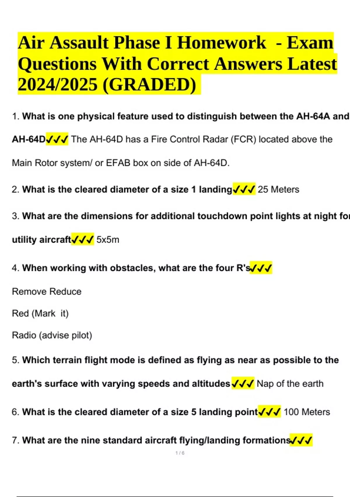 Air Assault Phase I Exam Questions With 100% Correct Answers Latest 2024/2025 (GRADED A+) What is one physical feature used to distinguish between the AH-64A and AH-64D The AH-64D has a Fire Control Radar (FCR) located above the Main Rotor system/ or EFAB box on side of AH-64D. 2. What is the cleared diameter of a size 1 landing 25 Meters 3. What are the dimensions for additional touchdown point lights at night for utility aircraft 5x5m 4. When working with obstacles, what are the four R's Remove Reduce Red (Mark it) Radio (advise pilot) 5. Which terrain flight mode is defined as flying as near as possible to the earth's surface with varying speeds and altitudes Nap of the earth 6. What is the cleared diameter of a size 5 landing point 100 Meters 7. What are the nine standard aircraft flying/landing formations Air Assault Phase I Homework - Exam Questions With Correct Answers Latest 2024/2025 (GRADED) 2 / 6 Trail Echelon Left Echelon Right Heavy Left Heavy Right Staggered Trail Left Staggered Trail Right Vee Diamond 8. What is the ACL of the UH-60A with seats 11 9. What is the ACL of combat equipped troops on the CH-47 (Army Standard) 33; Fort Campbell is 31 10. What reference materials covers Pathfinder Operations FM 3-21.38 11. There are 3 portions of the aircraft that you must avoid at all times, what are they 1. Main rotor 2. Tail Rotor 3. Cargo hook 12. How many Red Cross markings are on the HH-60 5 Markings 13. If the aircraft catches fire, what is the first thing you are going to do 3 / 6 Exit immediately (use common sense) 14. Who is the nucleus of the Air Assault Task Force Infantry 4 / 6 15. The OH-58D Kiowa Warrior has a cruising speed of what 80 Knots 16. UH-60A has a hook or lift capacity of what 8,000lbs 17. How many medics are assigned to the crew of a CH-47 during mass casualty evacuation No medics are "assigned" to the CH-47D/F. (But, during a mass casusalty or MASCAL evacuation, the CH-47D/F requires one medic for every six casualties.) 18. Who is overall responsible for the Air Assault mission PL/OIC 19. What is the distance between the base light and the number one touchdown point 14 meters 20. Who collects all personnel and equipment left behind on the PZ The Straggler Control Team 21. What is known as using the mobility of rotary wing assets and total integration of available fire-power, maneuvering under the control of a ground or air maneuver commander to engage enemy forces or to seize and hold key terrain Air Assault Operations 22. What is the cleared diameter of a size 4 land point 80 Meters 23. In what direction do the windows fall on the UH-60 Down and out 5 / 6 24. What are the five stages of the reverse planning system 1. Ground Tactical Plan 2. Landing Plan 3. Air movement plan 4. Loading plan 5. Staging Plan 25. If the height of the tallest obstacle is 5 meters, how far must you walk into your PZ/LZ to place your number one touchdown point 50 meters out (using the 10:1 ratio) 26. What is the ACL for the HH-60M Model Blackhawk 6 litter and 2 ambula- tory, or 3 litter and 5 ambulatory, or 8 ambulatory 27. What aircraft is commonly referred to as the 'Angel of Mercy?': OH-13 Sioux 28. The crew consists of what for the AH-64 Longbow Apache 2; Pilot, Co-pilot/Gunner 29. Aircraft that require different landing point sizes must be separated by how much 100 Meters 6 / 6 30. What is the primary mission of the OH-58D Reconnaissance 31. What is the cleared diameter of a size 3 landing point 50 Meters 32. What are the dimensions of the Inverted Y 7m x 14m x 14m 33. What size landing point does a UH-60 require when being used for a sling load operation Size 5