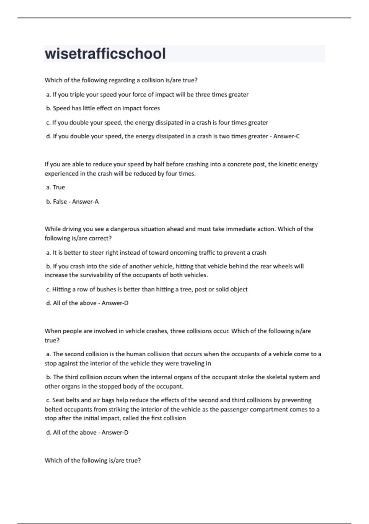 Which of the following regarding a collision is/are true? a. If you triple your speed your force of impact will be three times greater b. Speed has little effect on impact forces c. If you double your speed, the energy dissipated in a crash is four times greater d. If you double your speed, the energy dissipated in a crash is two times greater - Answer-C If you are able to reduce your speed by half before crashing into a concrete post, the kinetic energy experienced in the crash will be reduced by four times. a. True b. False - Answer-A While driving you see a dangerous situation ahead and must take immediate action. Which of the following is/are correct? a. It is better to steer right instead of toward oncoming traffic to prevent a crash b. If you crash into the side of another vehicle, hitting that vehicle behind the rear wheels will increase the survivability of the occupants of both vehicles. c. Hitting a row of bushes is better than hitting a tree, post or solid object d. All of the above - Answer-D When people are involved in vehicle crashes, three collisions occur. Which of the following is/are true? a. The second collision is the human collision that occurs when the occupants of a vehicle come to a stop against the interior of the vehicle they were traveling in b. The third collision occurs when the internal organs of the occupant strike the skeletal system and other organs in the stopped body of the occupant. c. Seat belts and air bags help reduce the effects of the second and third collisions by preventing belted occupants from striking the interior of the vehicle as the passenger compartment comes to a stop after the initial impact, called the first collision d. All of the above - Answer-D Which of the following is/are true?a. Vehicles are designed to dissipate the energy associated with collisions and to protect the passenger compartment b. When a collision occurs, the front and rear structures of vehicles are designed to deform and buckle in a carefully designed and controlled manner to dissipate the energy associated with the crash c. Vehicle design features are more effective if speed is reduced, drivers take actions to reduce the impact associated with collisions, and if vehicle occupants are wearing seatbelts d. All of the above - Answer-D Drivers exercise judgment and skill when they are behind the wheel. Of these two capabilities, driving skill is by far the most important. a. True b. False - Answer-B When driving, you should attempt to scan 20-30 seconds ahead of your vehicle. If you are traveling at highway speeds, 50, 60, or 70 miles per hour, you will travel about one mile per minute. Therefore, you should be scanning about how far ahead: a. About 100 feet b. About 500 feet c. About 1/2 mile d. About 1 mile - Answer-C to properly scan 20-30 seconds ahead, you should scan this entire distance ahead of your vehicle. As you scan ahead, you should: a. Identify situations, vehicles, or objects that could cause a problem by the time they reach the midpoint of your scanning distance about 15 seconds ahead of your vehicle. b. Be particularly alert for immediate hazards that may present themselves in the area that is 2-5 seconds ahead of your vehicle. c. Delay taking defensive actions such as slowing or changing lanes until the situation, vehicle or object ahead is 2-5 seconds ahead of your vehicle. d. Both a. and b. above - Answer-D Proper scanning of the roadway provides time for the driver to adjust speed and path to avoid dangerous situations. Which of the following is/are true? a. To accomplish proper scanning, look 20 to 30 seconds ahead and to the sides and rear to identify potentially dangerous situationsb. Drivers should adopt a mindset that says the driver approaching the intersection from the left or right may not stop at the traffic signal c. If scanning ahead identifies a potential danger, you must take action to avoid a crash d. All of the above - Answer-D The SIPDE process includes the following steps: Squinting, Influencing, Protecting, Driving, and Escaping. a. True b. False - Answer-B, SEARCH IDENTIFY PREDICT DECIDE EXECUTE