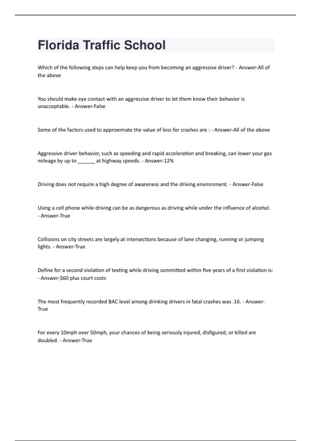Which of the following steps can help keep you from becoming an aggressive driver? - Answer-All of the above You should make eye contact with an aggressive driver to let them know their behavior is unacceptable. - Answer-False Some of the factors used to approximate the value of loss for crashes are : - Answer-All of the above Aggressive driver behavior, such as speeding and rapid acceleration and breaking, can lower your gas mileage by up to ______ at highway speeds. - Answer-12% Driving does not require a high degree of awareness and the driving environment. - Answer-False Using a cell phone while driving can be as dangerous as driving while under the influence of alcohol. - Answer-True Collisions on city streets are largely at intersections because of lane changing, running or jumping lights. - Answer-True Define for a second violation of texting while driving committed within five years of a first violation is: - Answer-$60 plus court costs The most frequently recorded BAC level among drinking drivers in fatal crashes was .16. - AnswerTrue For every 10mph over 50mph, your chances of being seriously injured, disfigured, or killed are doubled. - Answer-True