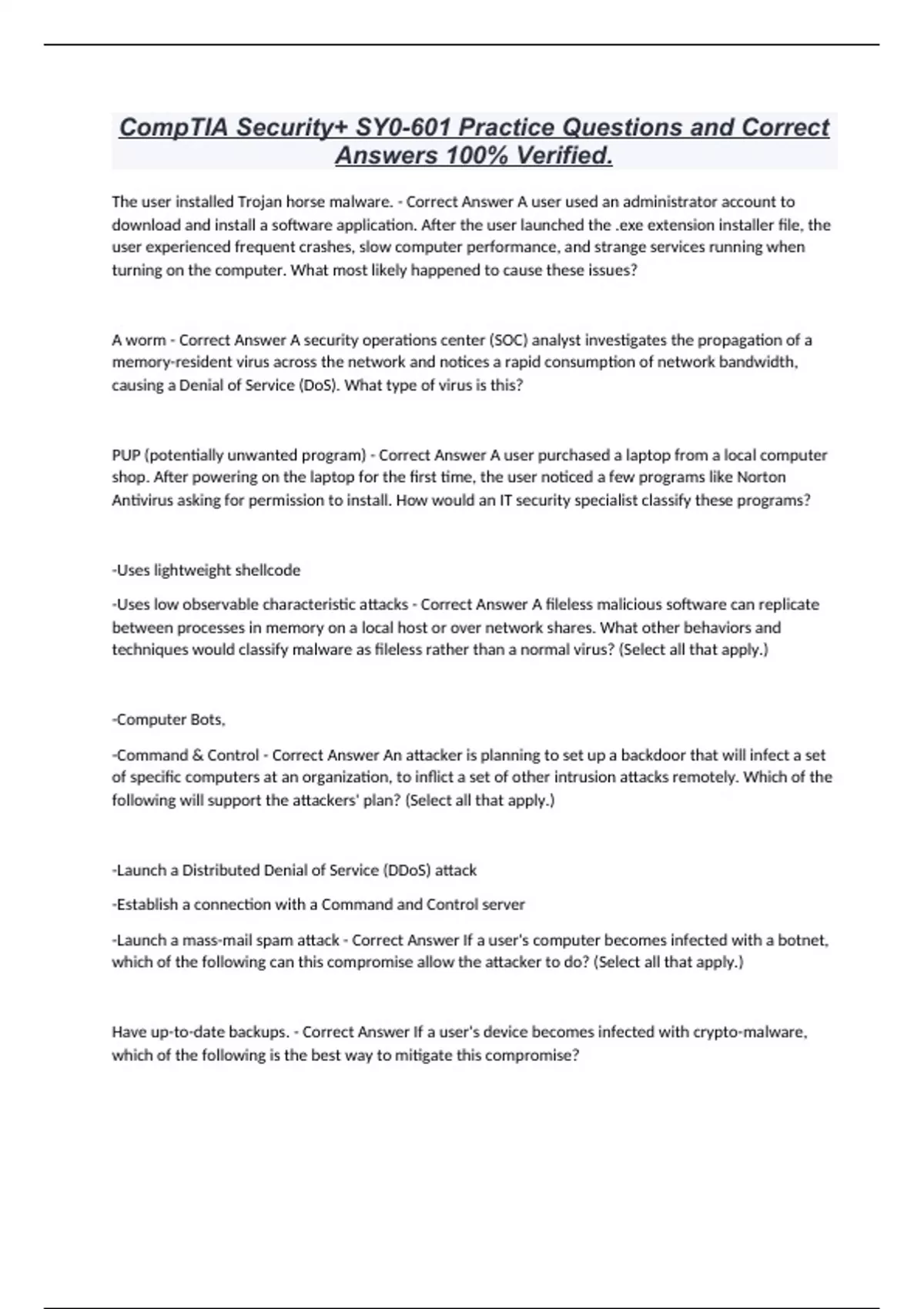 CompTIA Security+ SY0-601 Practice Questions and Correct Answers 100% Verified. The user installed Trojan horse malware. - Correct Answer A user used an administrator account to download and install a software application. After the user launched the .exe extension installer file, the user experienced frequent crashes, slow computer performance, and strange services running when turning on the computer. What most likely happened to cause these issues? A worm - Correct Answer A security operations center (SOC) analyst investigates the propagation of a memory-resident virus across the network and notices a rapid consumption of network bandwidth, causing a Denial of Service (DoS). What type of virus is this? PUP (potentially unwanted program) - Correct Answer A user purchased a laptop from a local computer shop. After powering on the laptop for the first time, the user noticed a few programs like Norton Antivirus asking for permission to install. How would an IT security specialist classify these programs? -Uses lightweight shellcode -Uses low observable characteristic attacks - Correct Answer A fileless malicious software can replicate between processes in memory on a local host or over network shares. What other behaviors and techniques would classify malware as fileless rather than a normal virus? (Select all that apply.) -Computer Bots, -Command & Control - Correct Answer An attacker is planning to set up a backdoor that will infect a set of specific computers at an organization, to inflict a set of other intrusion attacks remotely. Which of the following will support the attackers' plan? (Select all that apply.) -Launch a Distributed Denial of Service (DDoS) attack -Establish a connection with a Command and Control server -Launch a mass-mail spam attack - Correct Answer If a user's computer becomes infected with a botnet, which of the following can this compromise allow the attacker to do? (Select all that apply.) Have up-to-date backups. - Correct Answer If a user's device becomes infected with crypto-malware, which of the following is the best way to mitigate this compromise?