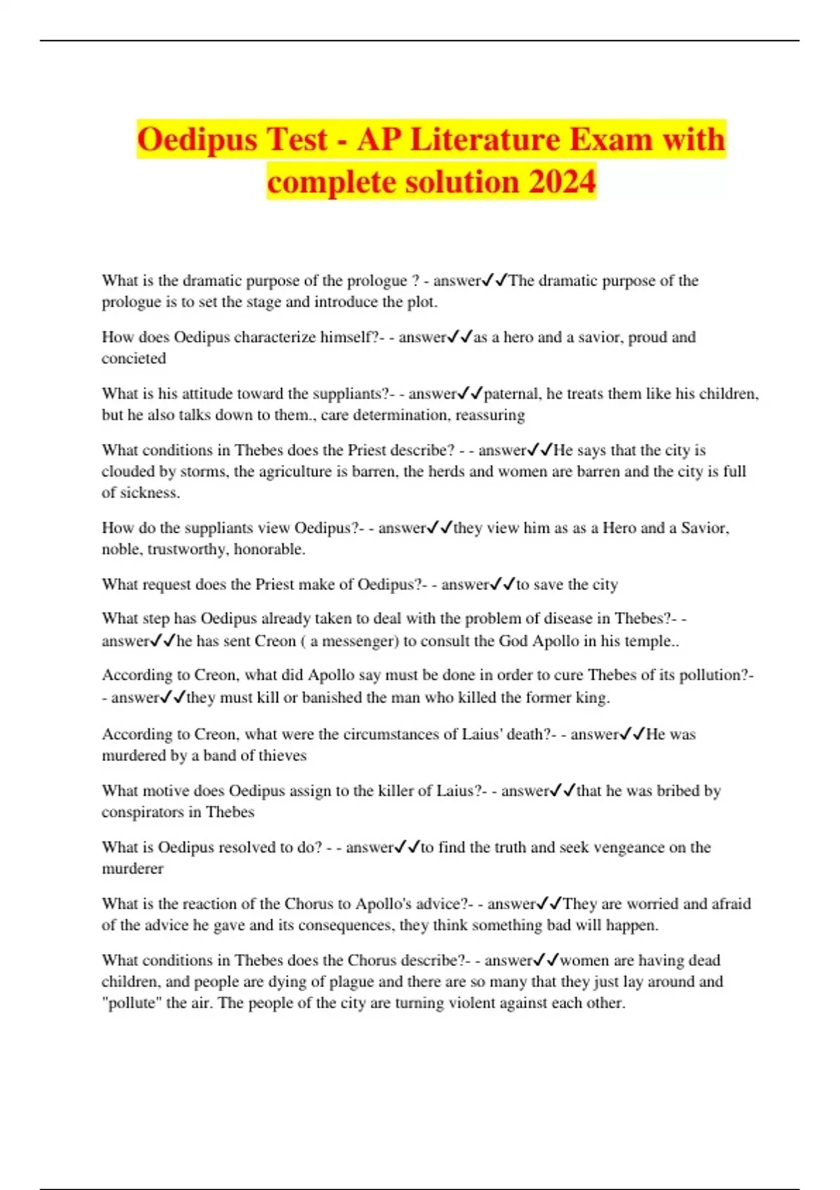 Oedipus Test - AP Literature Exam with complete solution 2024 What is the dramatic purpose of the prologue ? - answerThe dramatic purpose of the prologue is to set the stage and introduce the plot. How does Oedipus characterize himself?- - answeras a hero and a savior, proud and concieted What is his attitude toward the suppliants?- - answerpaternal, he treats them like his children, but he also talks down to them., care determination, reassuring What conditions in Thebes does the Priest describe? - - answerHe says that the city is clouded by storms, the agriculture is barren, the herds and women are barren and the city is full of sickness. How do the suppliants view Oedipus?- - answerthey view him as as a Hero and a Savior, noble, trustworthy, honorable. What request does the Priest make of Oedipus?- - answerto save the city What step has Oedipus already taken to deal with the problem of disease in Thebes?- - answerhe has sent Creon ( a messenger) to consult the God Apollo in his temple.. According to Creon, what did Apollo say must be done in order to cure Thebes of its pollution?- - answerthey must kill or banished the man who killed the former king. According to Creon, what were the circumstances of Laius' death?- - answerHe was murdered by a band of thieves What motive does Oedipus assign to the killer of Laius?- - answerthat he was bribed by conspirators in Thebes What is Oedipus resolved to do? - - answerto find the truth and seek vengeance on the murderer What is the reaction of the Chorus to Apollo's advice?- - answerThey are worried and afraid of the advice he gave and its consequences, they think something bad will happen. What conditions in Thebes does the Chorus describe?- - answerwomen are having dead children, and people are dying of plague and there are so many that they just lay around and "pollute" the air. The people of the city are turning violent against each other. Why does Oedipus summon Teiresias?- - answerbecause he reads Apollo's will and mind better than anyone else What is Teiresias' reaction to Oedipus' request for help?- - answerhe says the things that he knows will not help the situation, that the things Oedipus says will lead himself to ruin How does Oedipus view Tieresias' behavior?- - answerhe doesn't understand, he thinks he's being despondent and disloyal to the city of his birth What does Teiresias reveal to Oedipus as a result of the king's angry accusation?- - answerthat the King himself is the murderer of the former king, even though he doesn't know it. What suspicion does Oedipus begin to harbor about Creon?- - answerhe thinks that Creon is behind the plot and wants to take the crown and wealth from him. Why does Oedipus feel superior to Creon? - answerBecause Oedipus is King What does Teiresias predict will happen to Oedipus?- - answerthat a mother's and a father's curse will join and drive him out of Thebes and make him miserable, he will leave Thebes in poverty, with nothing but a staff, followed by his children which are also his siblings. How does the Chorus view Teiresias' accusations against Oedipus? - - answerThey think he only spoke out of anger and do not take the accusations seriously, they need proof and will only trust the gods, not prophets. After all, Oedipus was challenged by the sphinx and proved his wisdom in order to save the city What motivates Creon's entrance at the beginning of this episode?- - answerhe's heard that the king suspects his betrayal and is outraged, he doesn't want the people to see him as a traitor Why does Oedipus accuse Creon of conspiracy?- - answerhe thinks Creon told the profit to tell everyone that Oedipus was the killer so that Creon could get rid of Oedipus and take the throne How does Creon defend himself against Oedipus' accusation?- - answerhe asked why he would want the fears and responsibility of king when he has just as much power as an advisor and no worries, he has honor and advantage , people respect him, he has no need for the crown. What does Oedipus threaten to do? - - answerto kill Creon What does Jocasta attempt to do?- - answerto stop the argument and to get Oedipus to believe her and his own citizens Is Jacosta successful in stopping the argument and getting Oedipus to believe her and his citizens? - answerNo