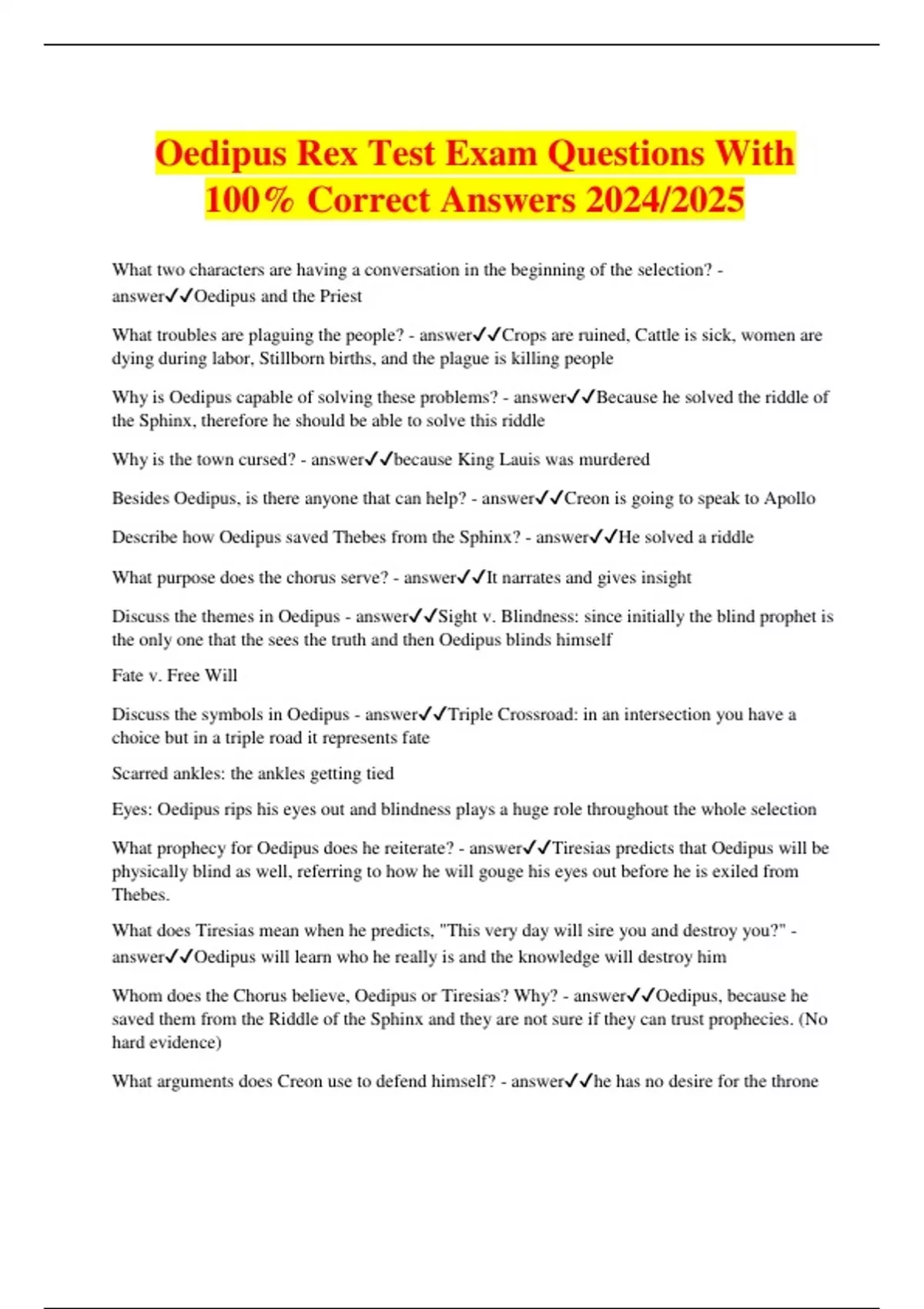 Oedipus Rex Test Exam Questions With 100% Correct Answers 2024/2025 What two characters are having a conversation in the beginning of the selection? - answerOedipus and the Priest What troubles are plaguing the people? - answerCrops are ruined, Cattle is sick, women are dying during labor, Stillborn births, and the plague is killing people Why is Oedipus capable of solving these problems? - answerBecause he solved the riddle of the Sphinx, therefore he should be able to solve this riddle Why is the town cursed? - answerbecause King Lauis was murdered Besides Oedipus, is there anyone that can help? - answerCreon is going to speak to Apollo Describe how Oedipus saved Thebes from the Sphinx? - answerHe solved a riddle What purpose does the chorus serve? - answerIt narrates and gives insight Discuss the themes in Oedipus - answerSight v. Blindness: since initially the blind prophet is the only one that the sees the truth and then Oedipus blinds himself Fate v. Free Will Discuss the symbols in Oedipus - answerTriple Crossroad: in an intersection you have a choice but in a triple road it represents fate Scarred ankles: the ankles getting tied Eyes: Oedipus rips his eyes out and blindness plays a huge role throughout the whole selection What prophecy for Oedipus does he reiterate? - answerTiresias predicts that Oedipus will be physically blind as well, referring to how he will gouge his eyes out before he is exiled from Thebes. What does Tiresias mean when he predicts, "This very day will sire you and destroy you?" - answerOedipus will learn who he really is and the knowledge will destroy him Whom does the Chorus believe, Oedipus or Tiresias? Why? - answerOedipus, because he saved them from the Riddle of the Sphinx and they are not sure if they can trust prophecies. (No hard evidence) What arguments does Creon use to defend himself? - answerhe has no desire for the throne