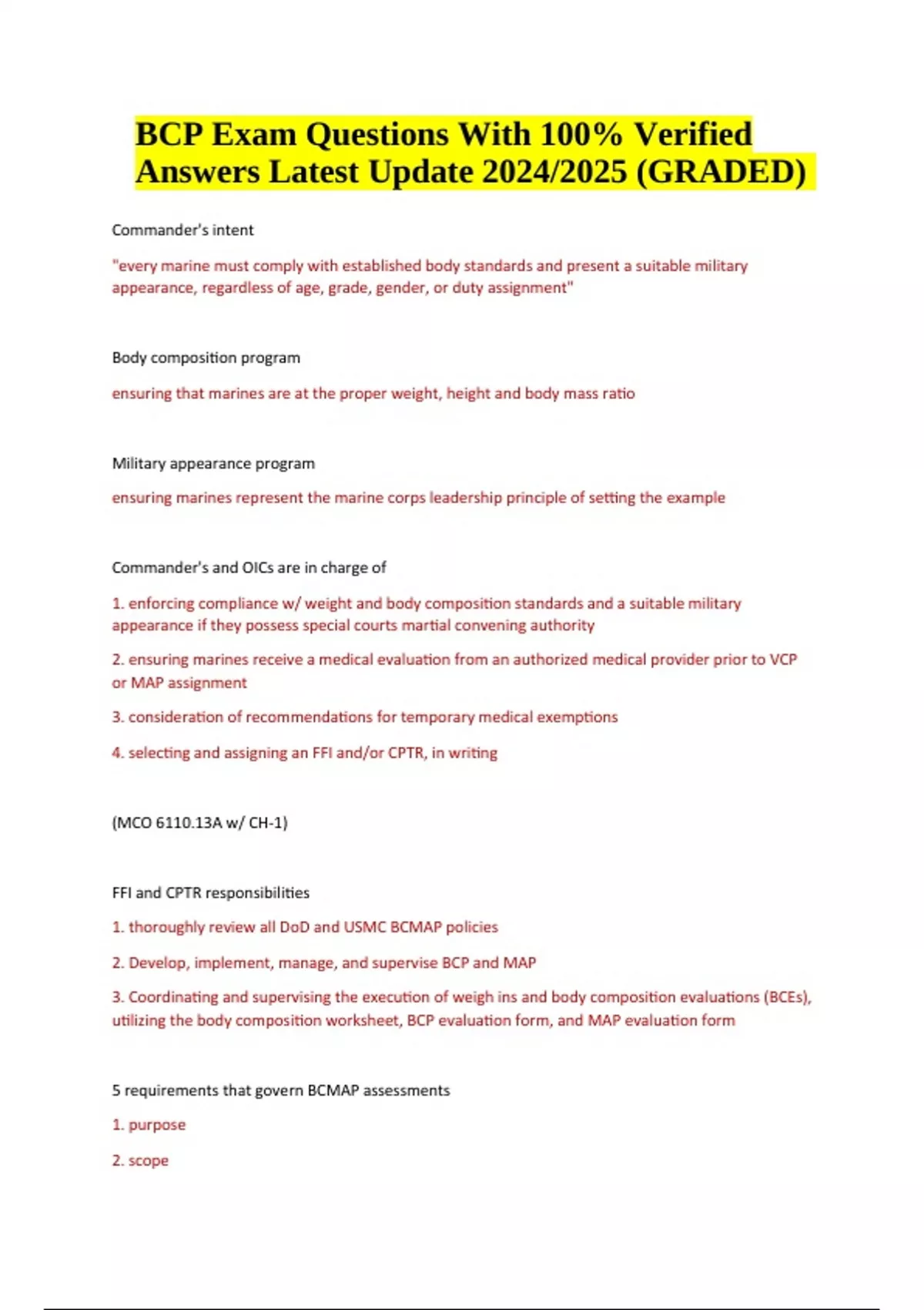BCP Exam Questions With 100% Verified Answers Latest Update 2024/2025 (GRADED A+) Body composition program ensuring that marines are at the proper weight, height and body mass ratio Military appearance program ensuring marines represent the marine corps leadership principle of setting the example Commander's and OICs are in charge of 1. enforcing compliance w/ weight and body composition standards and a suitable military appearance if they possess special courts martial convening authority 2. ensuring marines receive a medical evaluation from an authorized medical provider prior to VCP or MAP assignment 3. consideration of recommendations for temporary medical exemptions 4. selecting and assigning an FFI and/or CPTR, in writing (MCO 6110.13A w/ CH-1) FFI and CPTR responsibilities 1. thoroughly review all DoD and USMC BCMAP policies 2. Develop, implement, manage, and supervise BCP and MAP 3. Coordinating and supervising the execution of weigh ins and body composition evaluations (BCEs), utilizing the body composition worksheet, BCP evaluation form, and MAP evaluation form 5 requirements that govern BCMAP assessments 1. purpose 2. scope BCP Exam Questions With 100% Verified Answers Latest Update 2024/2025 (GRADED) 3. frequency of weigh ins 4. assessment sequence 5. standards Purpose of BCMAP -establishes, evaluates, and enforces compliance with optimal weight and body composition standards and a suitable military appearance -essential to the preservation of good order and discipline and necessary for the maintenance of combat readiness marine corps wide Scope of BCMAP -all marines will be periodically evaluated for weight and military appearance in accordance with the established frequency and sequence *weigh ins can occur the same day as CFT/PFT *CO can order weigh ins for entire unit or indiv. *inspector general and commanding generals can also call for weigh ins while conducting unannounced inspections Frequency of weigh ins at a minimum they are conducted semi-annually for every active duty and activated reservists * reserve weigh ins are conducted annually Medical exemptions -a marine cannot be formally assigned to the BCP or MAP prior to receiving a medical evaluation -all temporary medical exemptions require the endorsement of a board certified or board eligible military physician (BCBEMP) Body composition evaluation (BCE) -structured program that addresses the needs of marines who do not meet the established height and weight standards, present an unsuitable military appearance due to improper weight distribution, or both Height equipment -standard non-stretching fiberglass tape measure (1/4 -5/8 wide and affixed to a vertical surface) -wall mounted or self standing stadiometer Weight equipment -calibrated digital scale -calibrated balance beam scale Circumference equipment -self tensioning taping device, digital -self tensioning taping device, non-digital Serious consequences of being on BCP/MAP -not recommended for promotion -not recommended for re-enlistment -marine is discharged Height measurement procedure 1. ensure marine is not wearing footwear 2. standing w/ back against wall, heels flat on deck, shoulders back, arms to the side, head straight and forward 3. if using ruler, ensure it is parallel to the deck 4. record marine's height to nearest inch (less than 1/2 inch = round down, 1/2 inch or greater = round up) Weight measurement procedure 1. ensure marine is not wearing footwear 2. both feet on scale 3. feet centered in middle of scale 4. marine's hands by their side 5. record weight to nearest pound (subtract 1 pound for uniform) A marine has to go to BCE if they are not within height and weight standards and do not have a ___ on BOTH PFT and CFT 285 BCE steps 1. re-measure marine's height 2. use circumference based method to determines the marine's circumference 3. determines marine's body fat percentage What circumference do you use for males neck and abdomen What circumference do you use for females neck, waist, hips Neck measurement procedures: 1. with head straight forwards and chin parallel to deck, place curves portion of self-tensioning device on the right neck muscle so it conforms to the natural curvature of the neck muscle. the tape crosses the bottom of the larynx and is perpendicular to the long axis of the neck 2. place rod at the end of tape into slot of the self-tensioning device then press the button so the tape retracts to a snug fit 3. record, rounding up to nearest 1/2 inch abdomen measurement procedures: 1. marines head straight forward, chin parallel to deck, shoulders are down, arms are at side in relaxed manner, heels flat on deck 2. curved portion on right side of abdomen, cross center of navel and parallel to deck 3. round down to nearest 1/2 inch How to take and record measurements -take 3 measurements by 2 separate evaluators (neck then abdomen, then x2) -record all 6 measurements on a body composition worksheet -record lowest body fat percentage that results from the 6 sets of circumference measurements *if marine scores 250 or higher on both PFT/CFT they are allowed an additional 1% body fat limit male circumference value abdominal - neck female circumference value waist + hip - neck waist and hip taken by female waist = halfway between navel and breast bone -round down to nearest 1/2 inch