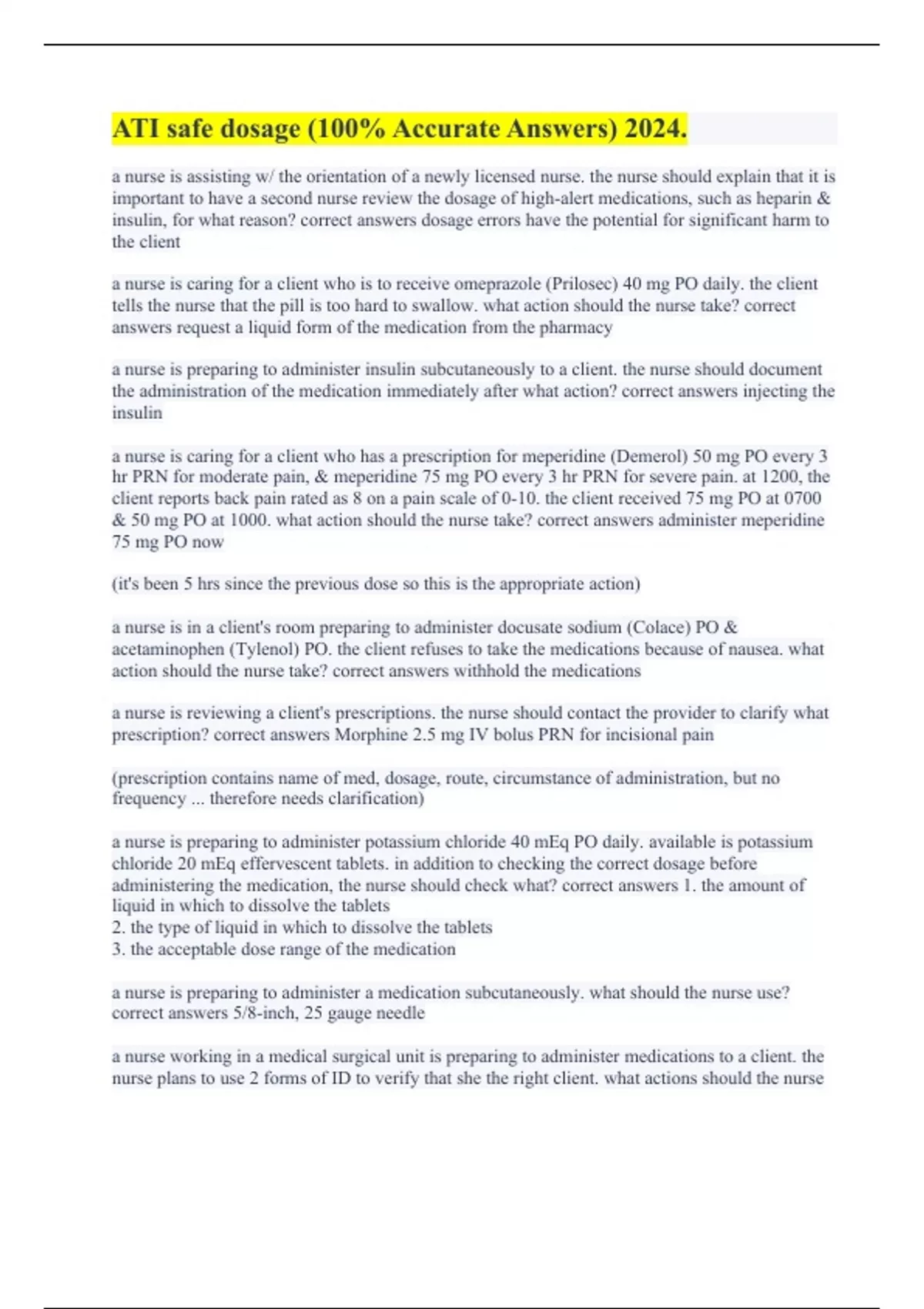 a nurse is assisting w/ the orientation of a newly licensed nurse. the nurse should explain that it is important to have a second nurse review the dosage of high-alert medications, such as heparin & insulin, for what reason? correct answers dosage errors have the potential for significant harm to the client a nurse is caring for a client who is to receive omeprazole (Prilosec) 40 mg PO daily. the client tells the nurse that the pill is too hard to swallow. what action should the nurse take? correct answers request a liquid form of the medication from the pharmacy a nurse is preparing to administer insulin subcutaneously to a client. the nurse should document the administration of the medication immediately after what action? correct answers injecting the insulin a nurse is caring for a client who has a prescription for meperidine (Demerol) 50 mg PO every 3 hr PRN for moderate pain, & meperidine 75 mg PO every 3 hr PRN for severe pain. at 1200, the client reports back pain rated as 8 on a pain scale of 0-10. the client received 75 mg PO at 0700 & 50 mg PO at 1000. what action should the nurse take? correct answers administer meperidine 75 mg PO now (it's been 5 hrs since the previous dose so this is the appropriate action) a nurse is in a client's room preparing to administer docusate sodium (Colace) PO & acetaminophen (Tylenol) PO. the client refuses to take the medications because of nausea. what action should the nurse take? correct answers withhold the medications a nurse is reviewing a client's prescriptions. the nurse should contact the provider to clarify what prescription? correct answers Morphine 2.5 mg IV bolus PRN for incisional pain (prescription contains name of med, dosage, route, circumstance of administration, but no frequency ... therefore needs clarification) a nurse is preparing to administer potassium chloride 40 mEq PO daily. available is potassium chloride 20 mEq effervescent tablets. in addition to checking the correct dosage before administering the medication, the nurse should check what? correct answers 1. the amount of liquid in which to dissolve the tablets 2. the type of liquid in which to dissolve the tablets 3. the acceptable dose range of the medication a nurse is preparing to administer a medication subcutaneously. what should the nurse use? correct answers 5/8-inch, 25 gauge needle a nurse working in a medical surgical unit is preparing to administer medications to a client. the nurse plans to use 2 forms of ID to verify that she the right client. what actions should the nurse
