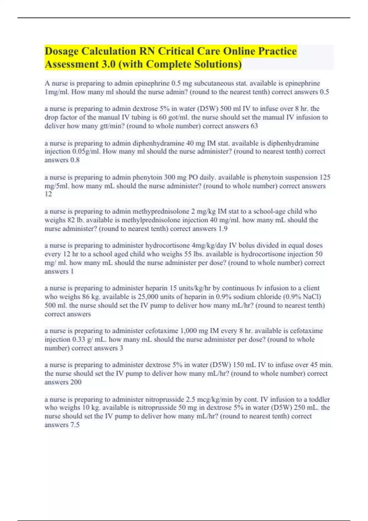 Dosage Calculation RN Critical Care Online Practice Assessment 3.0 (with Complete Solutions)