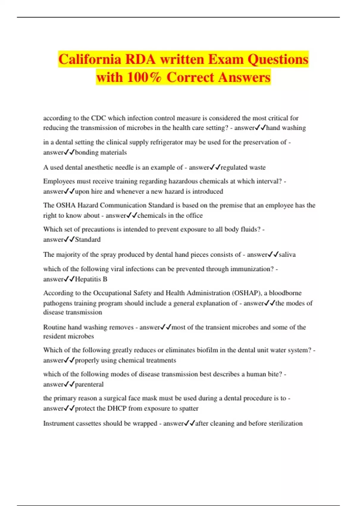California RDA written Exam Questions with 100% Correct Answers according to the CDC which infection control measure is considered the most critical for reducing the transmission of microbes in the health care setting? - answerhand washing in a dental setting the clinical supply refrigerator may be used for the preservation of - answerbonding materials A used dental anesthetic needle is an example of - answerregulated waste Employees must receive training regarding hazardous chemicals at which interval? - answerupon hire and whenever a new hazard is introduced The OSHA Hazard Communication Standard is based on the premise that an employee has the right to know about - answerchemicals in the office Which set of precautions is intended to prevent exposure to all body fluids? - answerStandard The majority of the spray produced by dental hand pieces consists of - answersaliva which of the following viral infections can be prevented through immunization? - answerHepatitis B According to the Occupational Safety and Health Administration (OSHAP), a bloodborne pathogens training program should include a general explanation of - answerthe modes of disease transmission Routine hand washing removes - answermost of the transient microbes and some of the resident microbes Which of the following greatly reduces or eliminates biofilm in the dental unit water system? - answerproperly using chemical treatments which of the following modes of disease transmission best describes a human bite? - answerparenteral the primary reason a surgical face mask must be used during a dental procedure is to - answerprotect the DHCP from exposure to spatter Instrument cassettes should be wrapped - answerafter cleaning and before sterilization Used radiograph fixer solution is usually considered - answerhazardous waste Which party is responsible for ensuring a Material Safety Data Sheet is available in the work place for each hazardous material? - answerEmployer Which of the following statements most accurately defines engineering controls? - answerMaterials and devices that prevent employees exposure to hazardous or infectious substances When using the air water syringe during dental treatment which of the following personal protective equipment are recommended by the CDC? - answergloves, mask, gown, and eye protection According to the Center for Disease Control and Prevention, patient-care items that penetrate soft tissue are categorized as - answercritical The purpose of a holding solution is to - answerprevent hardening of debris and body fluids on instruments Which barrier should be removed before temporarily leaving a patient to retrieve supplies? - answergloves The majority of organisms that make up dental unit waterline biofilm consists of - answerwater bacteria Material Safety Data Sheet (MSDS) are required by OSHA'S - answerHazardous Communication Standard Besides alcohol, which of the following is a common antimicrobial agent found in hand hygiene products? - answerChlorohexidine The accessibility of the exposure control plan for employees is the responsibility of the - answeremployer High- level disinfectants should be used - answeraccording to the manufacturer's directions Exposure of dental heathcare personnel to nitrous oxide gases can be reduced by - answerusing a scavenger system on the nitrous oxide equipment When putting on personal protective equipment, which barrier should be put on last, just before patient care begins? - answergloves To prepare for sterilization, the high-speed hand piece and reusable air-water syringe tip should be flushed with water - answerafter each patient Who is responsible for the evaluation of hazardous chemicals? - answerchemicals manufacturers and importers During normal use, which of the following is the most likely hazard for a dentist using a curing light? - answereye exposure to the light An exposure plan must be updated - answerannually and when new or modified tasks are introduced Wearing a punctured gloves during patient care may result in which type of microbial contact? - answerdirect Work practice controls include the use of a - answerone-handed recapping technique Heat sterilization of extracted teeth may result in - answerthe vaporization of mercury, presenting a health hazard. A person with a latent tuberculosis infection will - answerhave a positive skin test and no symptoms of active tuberculosis Which is the minimum temperature a steam sterilizer should reach to achieve sterilization? - answer121 degrees C Which of the following is an example of a clinical contract surface? - answercountertops which of the following is recommended to minimize the occupational exposure to atmospheric nitrous oxide? - answeruse a properly fitted nasal patient mask who is responsible for appropriate regulated waste disposal? - answerthe generation facility According to the OSHA Bloodborne Pathogens Standard, each dental office must have a exposure control plan that is - answerwritten and reviewed at least once every year The main purpose of surgical hand antisepsis is to - answerto reduce the chance for contamination of the patient if the glove become punctured or torn. According to the OSHA Bloodborne Pathogens Standard, a contaminated sharps container should be - answerpuncture resistant and closable According to the CDC, how long should sterilization monitoring records be kept? - answerAs required by state and local regulations Which of the following would be regulated under OSHA's Hazard Communication Standard? - answerbonding etchant To limit contamination, single- dose injectable medication should be - answerdiscarded after each use including leftover contents What is the recommended procedure when a sterilizer fails two consecutive spore tests? - answerdo not use the sterilizer until the reason for the failure has been determined and corrected
