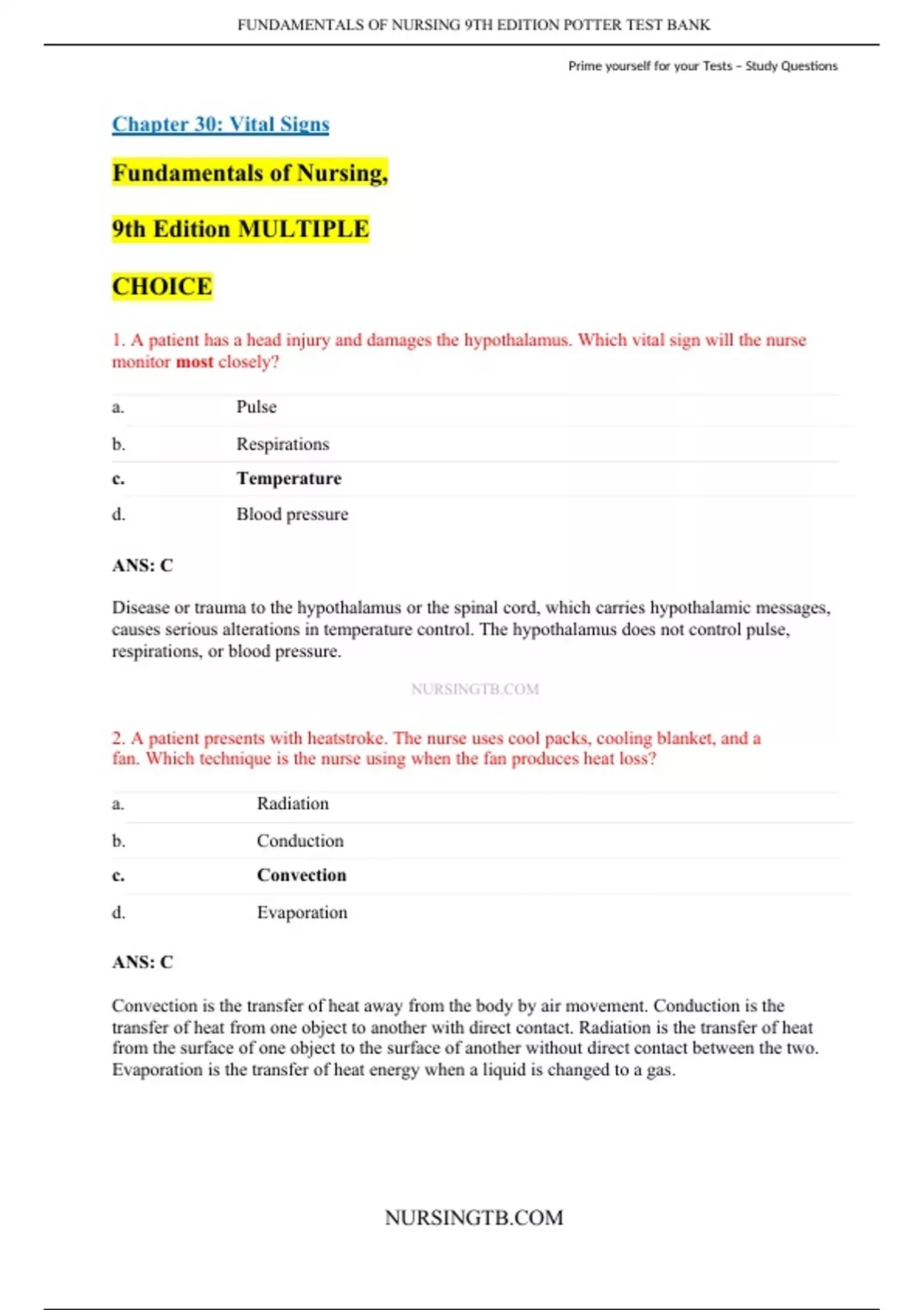Chapter 30: Vital Signs Fundamentals of Nursing, 9th Edition MULTIPLE CHOICE 1. A patient has a head injury and damages the hypothalamus. Which vital sign will the nurse monitor most closely? a. Pulse b. Respirations c. Temperature d. Blood pressure ANS: C Disease or trauma to the hypothalamus or the spinal cord, which carries hypothalamic messages, causes serious alterations in temperature control. The hypothalamus does not control pulse, respirations, or blood pressure. NURSINGTB.COM 2. A patient presents with heatstroke. The nurse uses cool packs, cooling blanket, and a fan. Which technique is the nurse using when the fan produces heat loss? a. Radiation b. Conduction c. Convection d. Evaporation ANS: C Convection is the transfer of heat away from the body by air movement. Conduction is the transfer of heat from one object to another with direct contact. Radiation is the transfer of heat from the surface of one object to the surface of another without direct contact between the two. Evaporation is the transfer of heat energy when a liquid is changed to a gas. 3. The patient has a temperature of 105.2° F. The nurse is attempting to lower temperature by providing tepid sponge baths and placing cool compresses in strategic body locations. Which technique is the nurse using to lower the patient’s temperature? a. Radiation b. Conduction c. Convection d. Evaporation ANS: B Applying an ice pack or bathing a patient with a cool cloth increases conductive heat loss because of the direct contact. Radiation is the transfer of heat from the surface of one object to the surface of another without direct contact between the two. Evaporation is the transfer of heat energy when a liquid is changed to a gas. Convection is the transfer of heat away from the body by air movement. 4. A nurse is focusing on temperature regulation of newborns and infants. Which action will the nurse take? NURSINGTB.COM a. Apply just a diaper. b. Double the clothing. c. Place a cap on their heads. d. Increase room temperature to 90 degrees. ANS: C A newborn loses up to 30% of body heat through the head and therefore needs to wear a cap to prevent heat loss. Temperature control mechanisms in newborns are immature and respond drastically to changes in the environment; do not increase the room temperature to 90 degrees. Take extra care to protect newborns from environmental temperatures. Provide adequate clothing; do not double the clothing or apply just a diaper. 5. The nurse is working the night shift on a surgical unit and is making 4:00 AM rounds. The nurse notices that the patient’s temperature is 96.8° F (36° C), whereas at 4:00 PM the preceding day, it was 98.6° F (37° C). What should the nurse do? a. Call the health care provider immediately to report a possible infection. b. Administer medication to lower the temperature further. c. Provide another blanket to conserve body temperature. d. Realize that this is a normal temperature variation. ANS: D Body temperature normally changes 0.5° to 1° C (0.9° to 1.8° F) during a 24-hour period and is usually lowest between 1:00 and 4:00 AM, with a maximum temperature at 4:00 PM, making this variation normal for the time of day. Unless the patient reports being cold, there is no physiological need for providing an extra blanket or medication to lower the body temperature further. There is also no need to call a health care provider to report a normal temperature variation. 6. The nurse is caring for a patient who hNaUsRaStIeNmGpTeBr.aCtOurMe reading of 100.4° F (38° C). The patient’s last two temperature readings were 98.6° F (37° C) and 96.8° F (36° C). Which action will the nurse take? a. Wait 30 minutes and recheck the patient’s temperature. b. Assume that the patient has an infection and order blood cultures. c. Encourage the patient to move around to increase muscular activity. d. Be aware that temperatures this high are harmful and affect patient safety. ANS: A Waiting 30 minutes and rechecking the patient’s temperature would be the most appropriate action in this case. A fever is usually not harmful if it stays below 102.2° F (39° C), and a single temperature reading does not always indicate a fever. In addition to physical signs and symptoms of infection, a fever determination is based on several temperature readings at different times of the day compared with the usual value for that person at that time. Nurses should base actions on knowledge, not on assumptions. Encouraging the patient to increase muscular activity will cause heat production to increase up to 50 times normal. The temperature has decreased and a symptom of infection would be an increase in temperature. 7. A patient is pyrexic. Which piece of equipment will the nurse obtain to monitor this condition? a. Stethoscope b. Thermometer c. Blood pressure cuff d. Sphygmomanometer ANS: B Pyrexia, or fever, occurs because heat loss mechanisms are unable to keep pace with excess heat production, resulting in an abnormal rise in body temperature; therefore, a thermometer is needed. A stethoscope is not used to take a temperature but can be used for apical pulse and blood pressure. A pulse oximeter is used to determine oxygen content in the blood. A sphygmomanometer and blood pressure cuff is used to determine blood pressure and will be used for blood pressure problems. 8. The nurse is caring for a patient who hNaUsRaSnINelGeTvBat.CedOMtemperature. Which principle will the nurse consider when planning care for this patient? a. Hyperthermia and fever are the same thing. b. Hyperthermia is an upward shift in the set point. c. Hyperthermia occurs when the body cannot reduce heat production. d. Hyperthermia results from a reduction in thermoregulatory mechanisms. ANS: C An elevated body temperature related to the inability of the body to promote heat loss or reduce heat production is hyperthermia. Whereas fever is an upward shift in the set point, hyperthermia results from an overload of the t