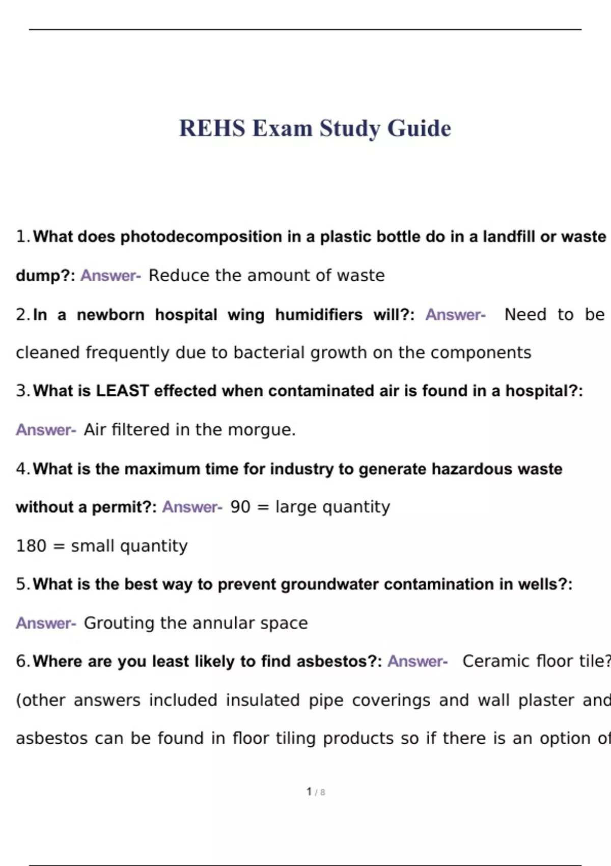 What does photodecomposition in a plastic bottle do in a landfill or waste dump? - Reduce the amount of waste In a newborn hospital wing humidifiers will? - Need to be cleaned frequently due to bacterial growth on the components What is LEAST effected when contaminated air is found in a hospital? - Air filtered in the morgue. What is the maximum time for industry to generate hazardous waste without a permit? - 90 = large quantity 180 = small quantity What is the best way to prevent groundwater contamination in wells? - Grouting the annular space Where are you least likely to find asbestos? - Ceramic floor tile? (other answers included insulated pipe coverings and wall plaster and asbestos can be found in floor tiling products so if there is an option of NONE OF THE ABOVE...maybe choose that one). What industry does the BISSC deal with? - Baking (stands for Baking Industry Sanitation Standards Committee). Which amendment deals with illegal search and seizure of private property? - 4th (IV) Groundwater Rule? - Protection against microbial organisms, reducing the risk of fecal contamination of the water for those who use the groundwater supply as a drinking source.