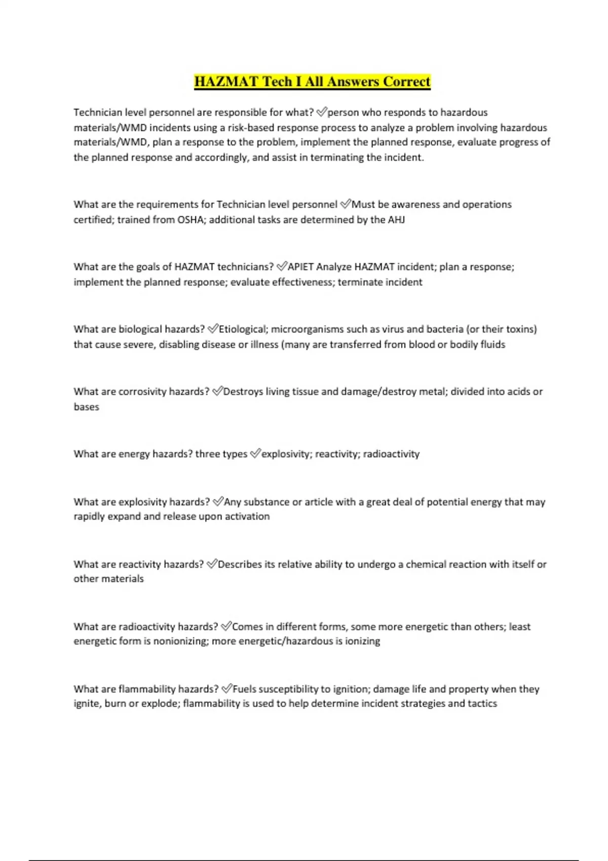 HAZMAT Tech I All Answers Correct