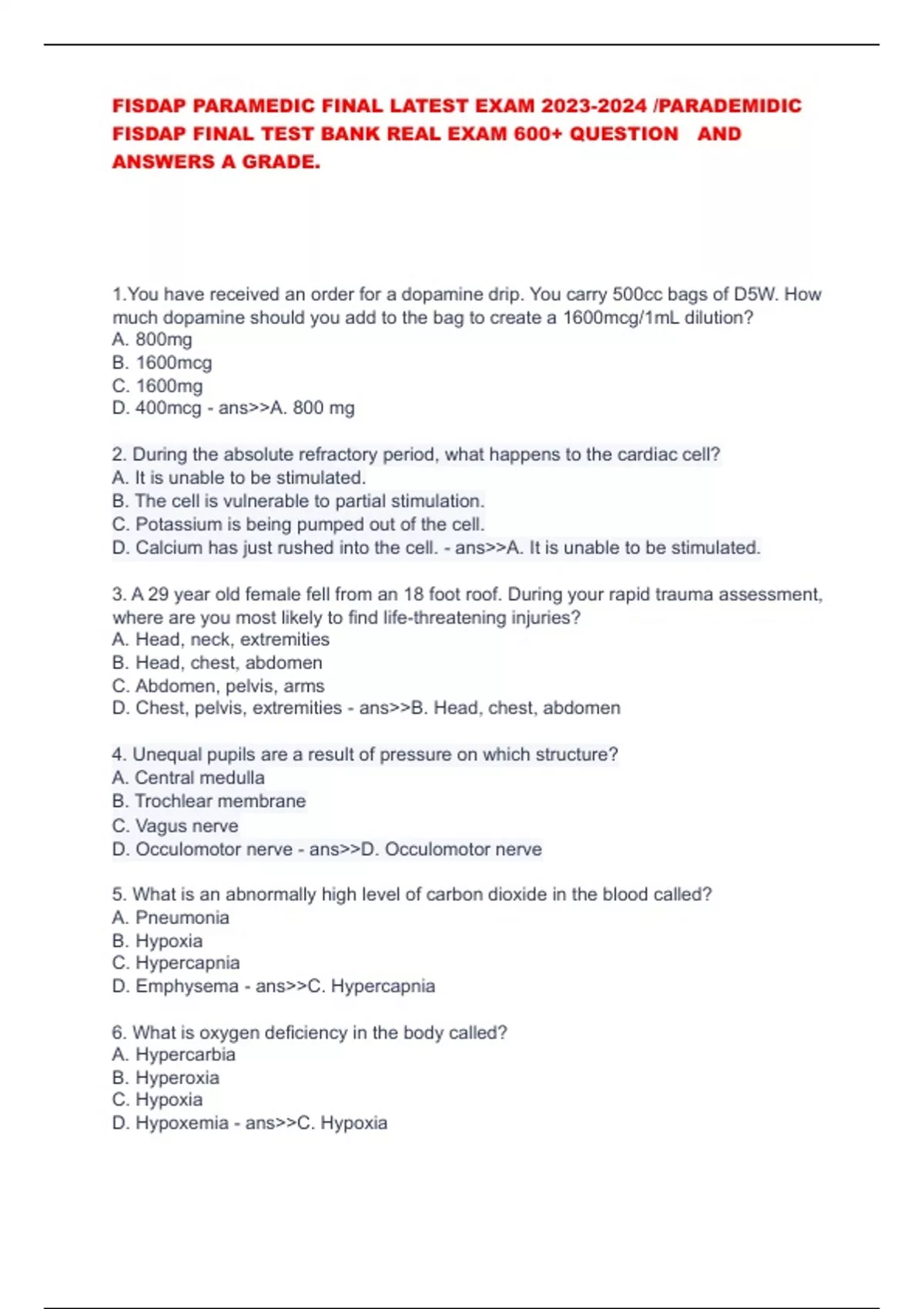 FISDAP PARAMEDIC FINAL LATEST EXAM /PARADEMIDIC FISDAP FINAL TEST BANK REAL EXAM 600+ QUESTION AND ANSWERS A GRADE.