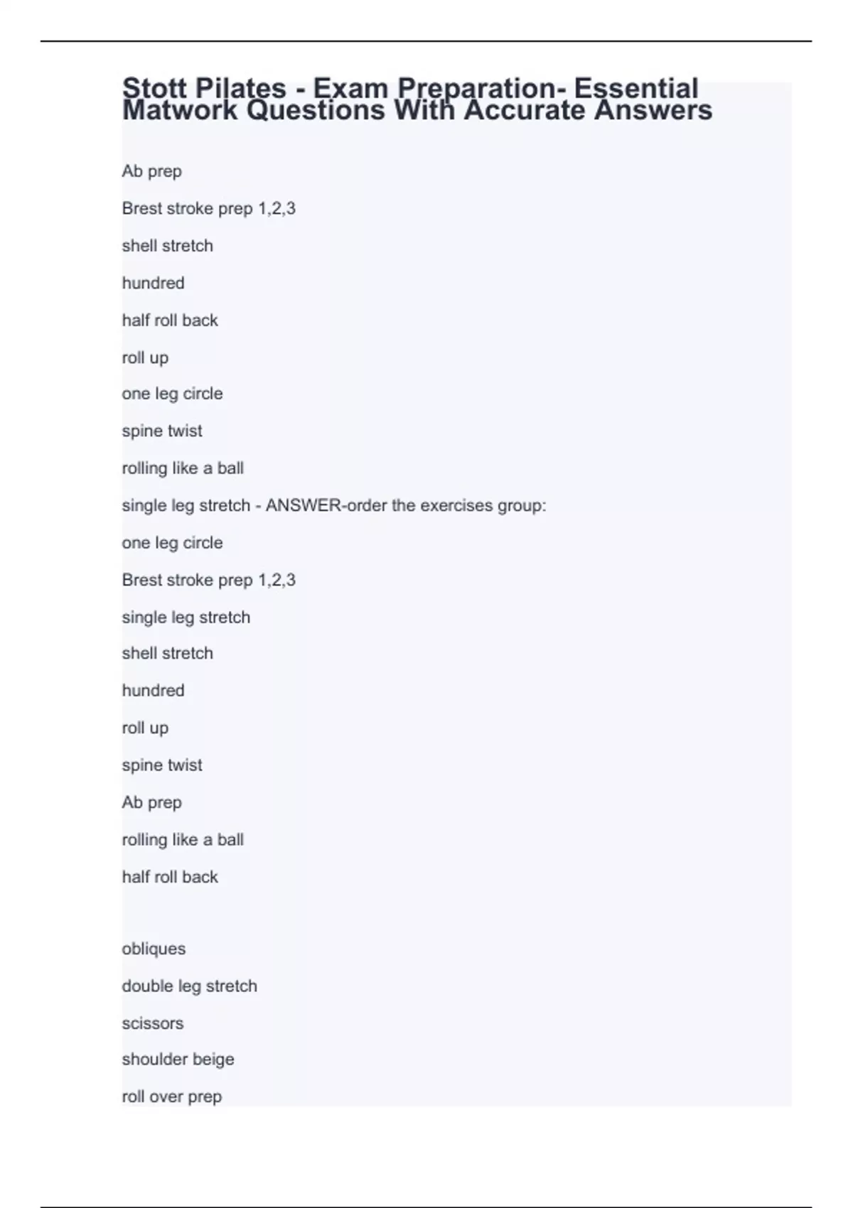 Stott Pilates - Exam Preparation- Essential Matwork Questions With Accurate Answers