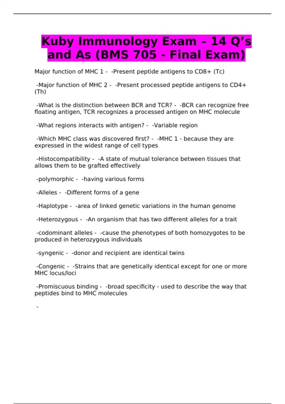 Kuby Immunology Exam – 14 Q’s and As (BMS 705 - Final Exam)