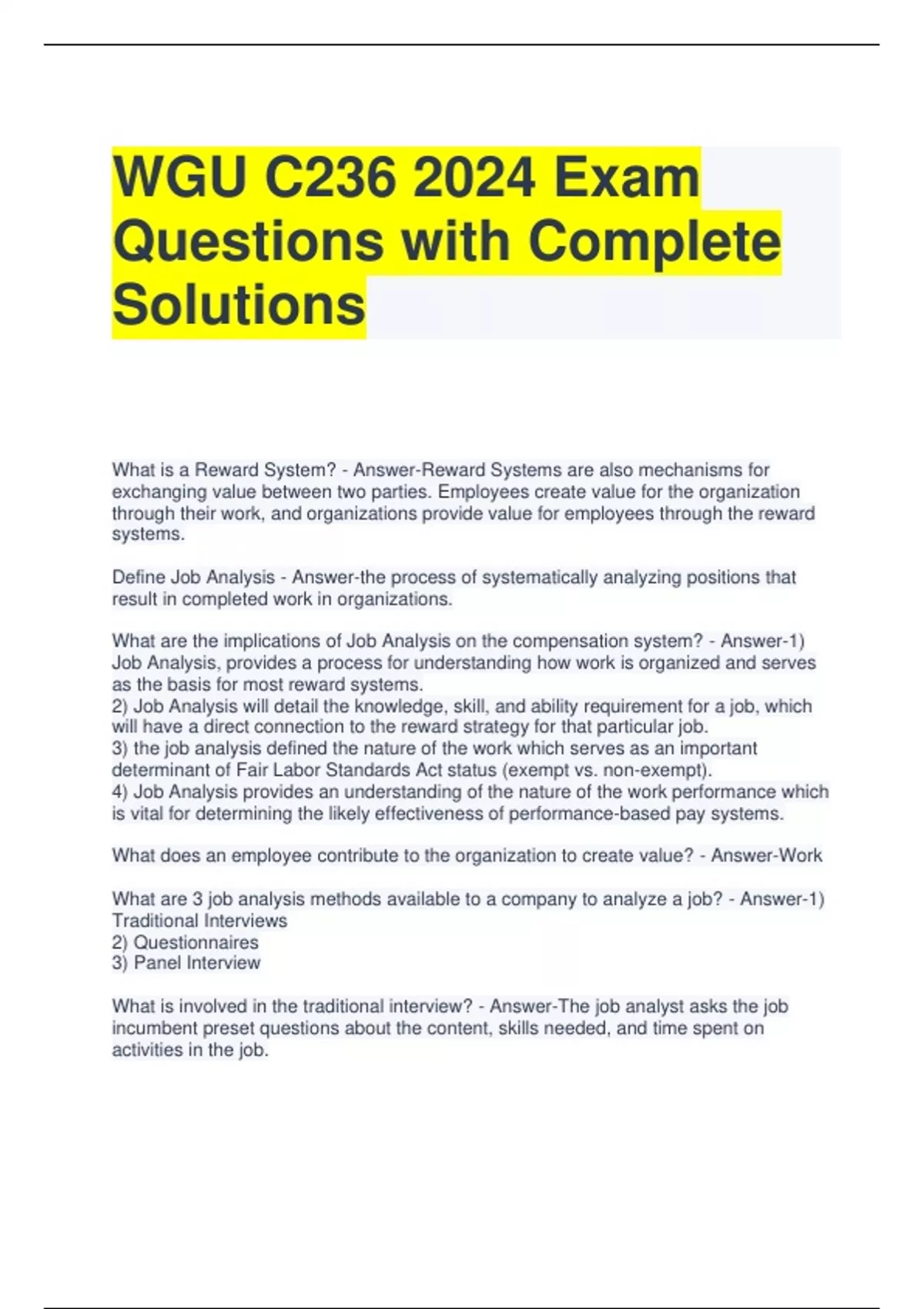 WGU C236 2024 Exam Questions with Complete Solutions What is a Reward System? - Answer-Reward Systems are also mechanisms for exchanging value between two parties. Employees create value for the organization through their work, and organizations provide value for employees through the reward systems. Define Job Analysis - Answer-the process of systematically analyzing positions that result in completed work in organizations. What are the implications of Job Analysis on the compensation system? - Answer-1) Job Analysis, provides a process for understanding how work is organized and serves as the basis for most reward systems. 2) Job Analysis will detail the knowledge, skill, and ability requirement for a job, which will have a direct connection to the reward strategy for that particular job. 3) the job analysis defined the nature of the work which serves as an important determinant of Fair Labor Standards Act status (exempt vs. non-exempt). 4) Job Analysis provides an understanding of the nature of the work performance which is vital for determining the likely effectiveness of performance-based pay systems. What does an employee contribute to the organization to create value? - Answer-Work What are 3 job analysis methods available to a company to analyze a job? - Answer-1) Traditional Interviews 2) Questionnaires 3) Panel Interview What is involved in the traditional interview? - Answer-The job analyst asks the job incumbent preset questions about the content, skills needed, and time spent on activities in the job. How is the panel interview used to analyze a job? - Answer-Multiple job incumbents (and sometimes multiple job analysts) all meet together to analyze the job. In panel interviews, the job incumbents themselves explore the agreement and contradictions in their responses. What analysis method does an organization use to overcome some of the limitations of interview methods? - Answer-Questionares When creating a job analysis who should you speak with for input? - Answer-In small organizations, the information may be gathered from every incumbent of a given job. As the number of job incumbents per job increases, organizations typically try to make the process more efficient by choosing a subset of the job incumbents to be involved in the process. Why is it necessary to gain buy in for a job analysis to create a value-added analysis? - Answer-It is important to involve people from all levels in the organization, not only to increase the quality of the information, but also to obtain buy-in from those who will be using it for reward decisions.