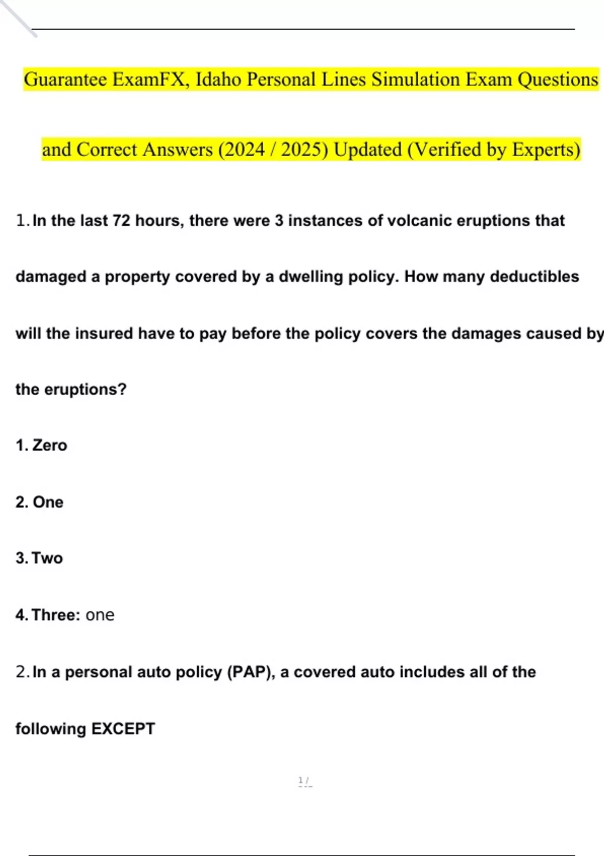 Guarantee ExamFX, Idaho Personal Lines Simulation Exam Questions and Answers (2024 / 2025) Updated Latest (Verified Answers)