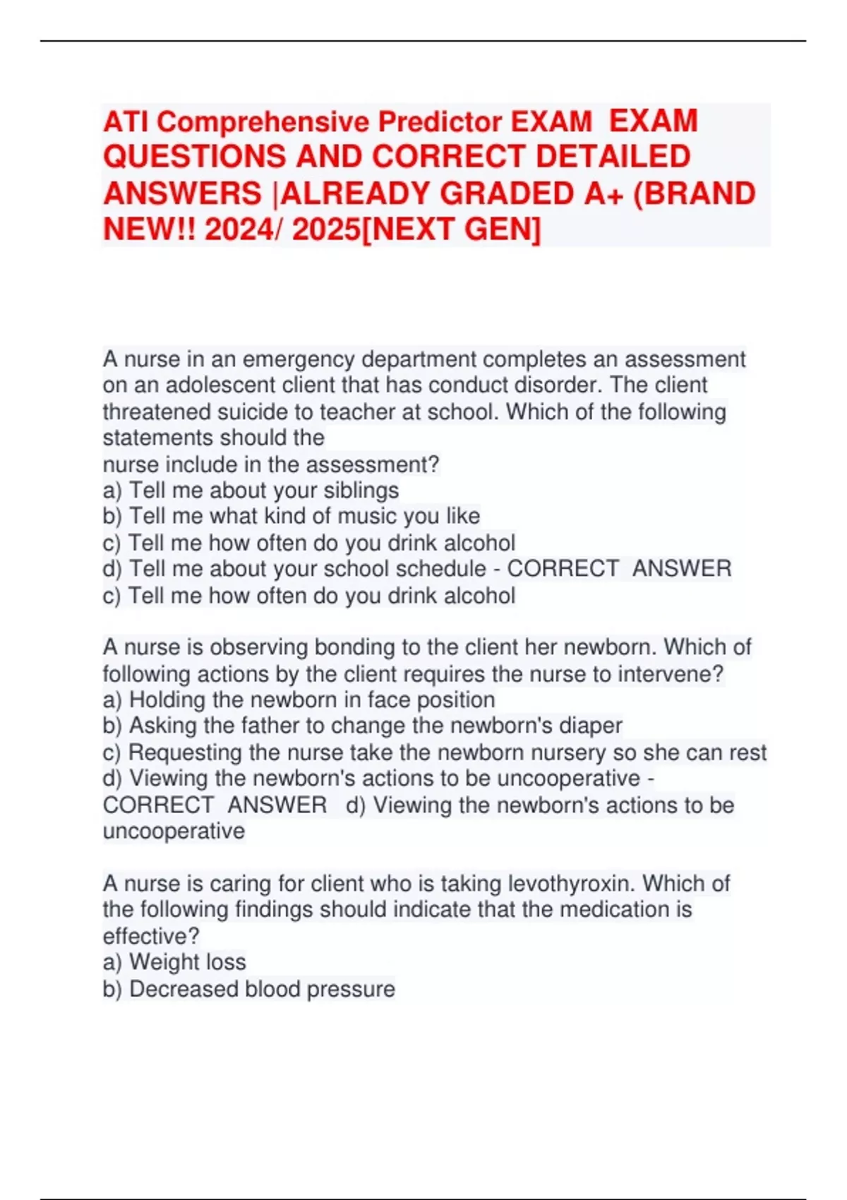 ATI Comprehensive Predictor EXAM EXAM QUESTIONS AND CORRECT DETAILED ANSWERS |ALREADY GRADED A+ (BRAND NEW!! 2024/ 2025[NEXT GEN] A nurse in an emergency department completes an assessment on an adolescent client that has conduct disorder. The client threatened suicide to teacher at school. Which of the following statements should the nurse include in the assessment? a) Tell me about your siblings b) Tell me what kind of music you like c) Tell me how often do you drink alcohol d) Tell me about your school schedule - CORRECT ANSWER c) Tell me how often do you drink alcohol A nurse is observing bonding to the client her newborn. Which of following actions by the client requires the nurse to intervene? a) Holding the newborn in face position b) Asking the father to change the newborn's diaper c) Requesting the nurse take the newborn nursery so she can rest d) Viewing the newborn's actions to be uncooperative - CORRECT ANSWER d) Viewing the newborn's actions to be uncooperative A nurse is caring for client who is taking levothyroxin. Which of the following findings should indicate that the medication is effective? a) Weight loss b) Decreased blood pressure c) Absence of seizures d) Decrease inflammation - CO