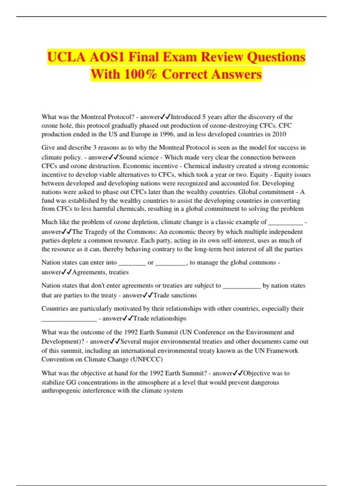 UCLA AOS1 Final Exam Review Questions With 100% Correct Answers What was the Montreal Protocol? - answerIntroduced 5 years after the discovery of the ozone hole, this protocol gradually phased out production of ozone-destroying CFCs. CFC production ended in the US and Europe in 1996, and in less developed countries in 2010 Give and describe 3 reasons as to why the Montreal Protocol is seen as the model for success in climate policy. - answerSound science - Which made very clear the connection between CFCs and ozone destruction. Economic incentive - Chemical industry created a strong economic incentive to develop viable alternatives to CFCs, which took a year or two. Equity - Equity issues between developed and developing nations were recognized and accounted for. Developing nations were asked to phase out CFCs later than the wealthy countries. Global commitment - A fund was established by the wealthy countries to assist the developing countries in converting from CFCs to less harmful chemicals, resulting in a global commitment to solving the problem Much like the problem of ozone depletion, climate change is a classic example of __________ - answerThe Tragedy of the Commons: An economic theory by which multiple independent parties deplete a common resource. Each party, acting in its own self-interest, uses as much of the resource as it can, thereby behaving contrary to the long-term best interest of all the parties Nation states can enter into ________ or _________, to manage the global commons - answerAgreements, treaties Nation states that don't enter agreements or treaties are subject to ___________ by nation states that are parties to the treaty - answerTrade sanctions Countries are particularly motivated by their relationships with other countries, especially their ________________ - answerTrade relationships What was the outcome of the 1992 Earth Summit (UN Conference on the Environment and Development)? - answerSeveral major environmental treaties and other documents came out of this summit, including an international environmental treaty known as the UN Framework Convention on Climate Change (UNFCCC) What was the objective at hand for the 1992 Earth Summit? - answerObjective was to stabilize GG concentrations in the atmosphere at a level that would prevent dangerous anthropogenic interference with the climate system UNFCCC does not set _____________ or specify how parties to the treaty should attempt to lower their emissions, instead it establishes the ____________ by which these things are negotiated and agreed to - answerGreenhouse Gas Emissions Targets, process ________________ is when all parties to the treaty send delegates to this conference, where more specifics are hammered out - answerAnnual Conference of Parties Documents outlining these specifics, such as emissions targets, are known as ______________ - answerProtocols In 1997, the _____________________ set emissions targets that signing parties would have to meet between 2008 and 2012 known as first commitment period - answerKyoto Protocol The Kyoto Protocol separated countries into two categories. What were they and what separated the two categories? - answerDeveloped Countries (Annex I) and Developing Countries (Non-Annex I) Annex I had GG emissions reduction obligations and must submit an annual GG inventory. Annex II had no GG emission reduction obligations What was the "North-South Debate" that the Kyoto Protocol sparked? - answerDeveloping countries in the global "South" insisted on their right to develop and emit GGs, pointing out that developed countries are responsible for the lion's share of cumulative emissions. Many developed countries in the global "North" refused to take on emissions reductions obligations if developing countries didn't. Why was the Kyoto Protocol ultimately a failure? - answerThe "North-South Debate" caused many of the biggest emitters to not participate. Only some countries met their Kyoto targets between 2008 and 2012. Paris Agreement was adopted with the goal of keeping global warming below __________, was also the threshold set by the Copenhagen and Doha agreements - answer2 degrees celsius Why do these agreements focus on the 2 C threshold? - answerIt was arbitrarily set by policymakers because they needed a specific goal in order to get countries to commit to cutting emissions. The problem is that it's a difficult threshold to stay under, only RCP2.6 will confidently keep us below it. Why is the Paris Agreement distinct from previous agreements? - answerOther agreements used a 'top-down' approach that set and imposed emissions reduction targets for all countries, lacked commitment, and they missed clear ways of monitoring and enforcing emissions targets. The Paris Agreement used a 'bottom-up' approach that allowed countries to set their own emissions reduction targets