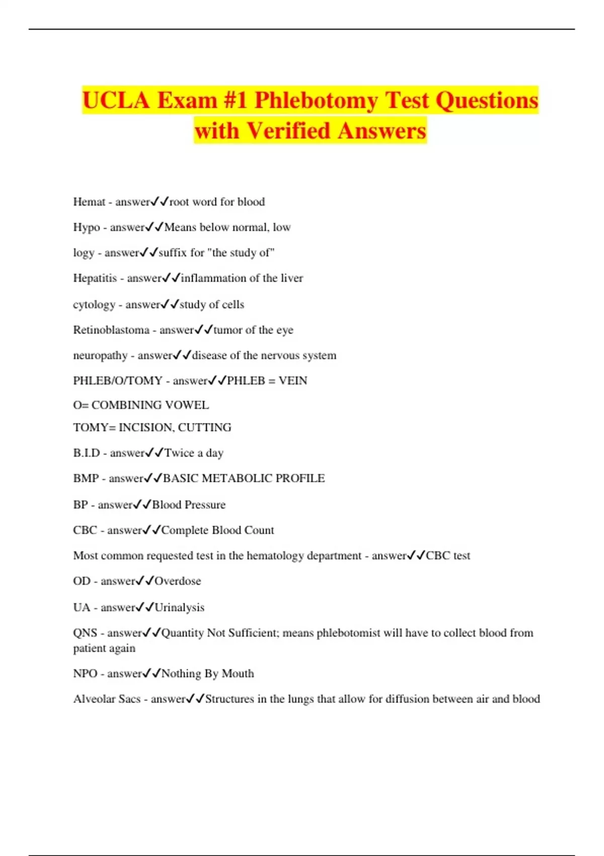 UCLA Exam #1 Phlebotomy Test Questions with Verified Answers Hemat - answerroot word for blood Hypo - answerMeans below normal, low logy - answersuffix for "the study of" Hepatitis - answerinflammation of the liver cytology - answerstudy of cells Retinoblastoma - answertumor of the eye neuropathy - answerdisease of the nervous system PHLEB/O/TOMY - answerPHLEB = VEIN O= COMBINING VOWEL TOMY= INCISION, CUTTING B.I.D - answerTwice a day BMP - answerBASIC METABOLIC PROFILE BP - answerBlood Pressure CBC - answerComplete Blood Count Most common requested test in the hematology department - answerCBC test OD - answerOverdose UA - answerUrinalysis QNS - answerQuantity Not Sufficient; means phlebotomist will have to collect blood from patient again NPO - answerNothing By Mouth Alveolar Sacs - answerStructures in the lungs that allow for diffusion between air and blood Amniotic Fluid - answerfluid form amniotic sac Atria - answer(atriums) upper chambers of the heart. Ventricles - answerlower chambers of the heart Aorta - answerlargest artery in the body Arteries - answercarry oxygenated blood away from the heart, except for pulmonary artery to lungs which carries deoxygenated blood. arterioles - answersmaller branches of arteries. superior vena cava - answerone of the largest veins in the circulatory system that carries deoxygenated blood from the upper parts of the body such as, head, neck, and chest. Inferior Vena Cava - answerone of the two largest veins that bring deoxygenated blood from the lower parts of the body. veins - answerCarry deoxygenated blood back to the heart venules - answersmaller branches of veins Capillaries - answerMicroscopic, unicellular blood vessels linking arterioles and venules collection of blood from finger in adults collection of blood from heel in infants. Blood Vessels - answer1. Transport Blood 2. Key to Circulatory System 3. Includes, arteries, veins, venules, arterioles, and capillaries Circulatory System - answerComposed of heart, blood vessels, and blood Antecubital Fossa - answer1. Where the elbow bends 2. Anterior 3. Major veins of venipuncture are found here for blood collection. Median Cubital Vein - answer1. 1st choice of blood collection (venipuncture) 2. Most commonly used by phlebotomist Cephalic Vein - answer2nd choice of blood collection (venipuncture),