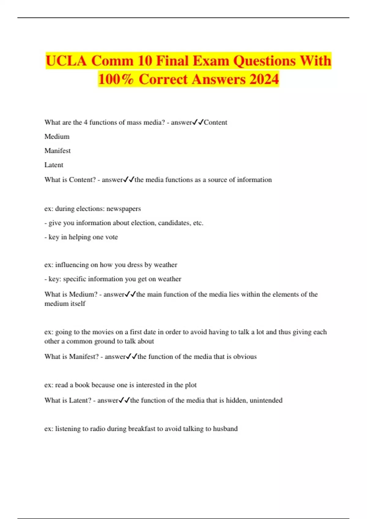 UCLA Comm 10 Final Exam Questions With 100% Correct Answers 2024 What are the 4 functions of mass media? - answerContent Medium Manifest Latent What is Content? - answerthe media functions as a source of information ex: during elections: newspapers - give you information about election, candidates, etc. - key in helping one vote ex: influencing on how you dress by weather - key: specific information you get on weather What is Medium? - answerthe main function of the media lies within the elements of the medium itself ex: going to the movies on a first date in order to avoid having to talk a lot and thus giving each other a common ground to talk about What is Manifest? - answerthe function of the media that is obvious ex: read a book because one is interested in the plot What is Latent? - answerthe function of the media that is hidden, unintended ex: listening to radio during breakfast to avoid talking to husband What are the 6 (Societal) Functions of Mass Media? - answerStatus Confirm Pass on/Enforces traditions, norms, values Narcotizing Effect Services Political System Create Social Cohesion Services Economy How does it Confirm Status? - answerMedia confirms status of organization, people, event by reporting on them; thus making them important - media legitimizes people/issues ex: Gay student killed: media covered; gay rights got covered How does it Pass on/Enforces traditions, norms, values? - answerMedia tells what's right and what's wrong - certain news tells what to do and makes sure you follow them - usually mass media upholds status quo - giving homogenizing effect ex: man doesn't pay taxes: story comes out then he went to jail How does it have a Narcotizing Effect? - answernarcotics: destroys senses - media blinds and distorts our senses; thus, failing to support critical thinking ex: media floods us with information so much that we're numb and don't have time to carefully consider - makes us apathetic; thus, failing to raise critical questions and thinking How does it service Political System? - answerleaders use mass media to address public ex: tells you what's happening on your news feed - learn what candidates say helps political system work How does it create Social Cohesion? - answerbrings us together - gather around particular social website ex: jumps online to see what's going on during dramatic crisis ex: 9/11 -- victims, volunteers being alone --> scared watching TV --> brings together How does it service Economy? - answerhelps economy work with business/market reports - advertising makes capitalist economy work - sells products = more jobs - use internet for commerce What are the 8 functions of Mass Media served for individuals? - answerGuide our Behavior Guide our Understanding Professional Tool Develop Self Concept Facilitate Social Interactions Substitute for Social Interaction Emotional Release Ritualizes our Lives How does it guide our behavior? - answerwhat we learn from the media can influence our actions ex: watching movies and seeing how they behave in dates; thus, influencing one's behavior in dates How does it guide our understanding? - answermedia can influence how we think about the world - gives us a grasp on the world ex: Mean World Syndrome - mass media makes viewers believe that the world is more dangerous than it actually is - you used to take walks, but TV made you think that it was scary; thus, not wanting to walk anymore and just staying inside How is it a professional tool? - answermedia helps careers ex: lawyer read law journal to help in career - internet allows people to come together () How does it develop self concept? - answermedia can influence how you think about yourself - identification: create concepts about yourself (who are your role models?) ex: watching grey's anatomy: wants to become a doctor How does it facilitate social interactions? - answermediates ex: social media (twitter, facebook) brings people together How does it substitute for social interactions? - answerconnects with people through media - gives you indirect companionship ex: watching Friends (on netflix) - you aren't alone - forming substitute for real life humans How does it have an emotional release? - answercarries you out to another emotion ex: tired --> listens to music How does it ritualize our lives? - answergives order / sense of structure - brings us security