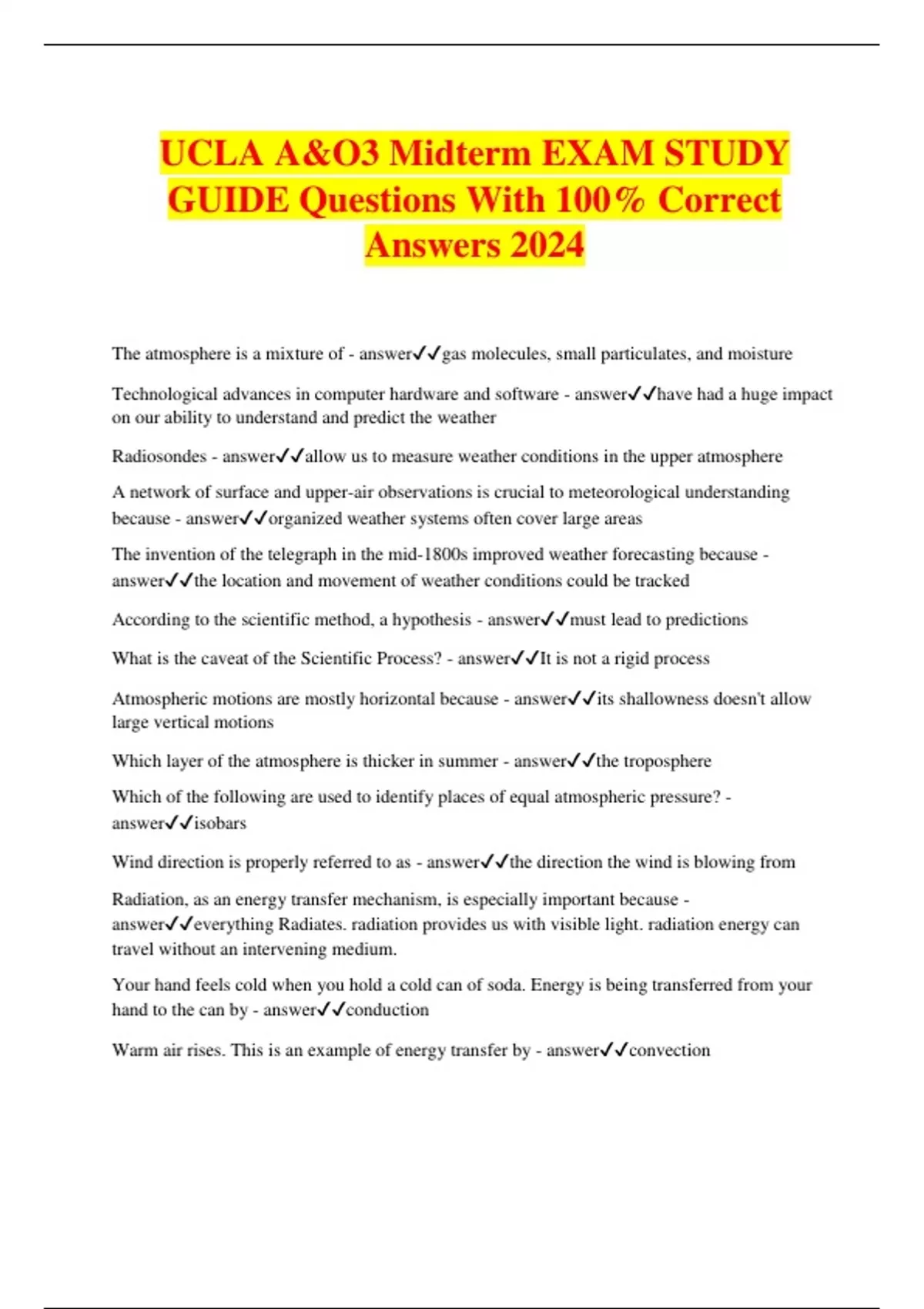 UCLA A&O3 Midterm EXAM STUDY GUIDE Questions With 100% Correct Answers 2024 The atmosphere is a mixture of - answergas molecules, small particulates, and moisture Technological advances in computer hardware and software - answerhave had a huge impact on our ability to understand and predict the weather Radiosondes - answerallow us to measure weather conditions in the upper atmosphere A network of surface and upper-air observations is crucial to meteorological understanding because - answerorganized weather systems often cover large areas The invention of the telegraph in the mid-1800s improved weather forecasting because - answerthe location and movement of weather conditions could be tracked According to the scientific method, a hypothesis - answermust lead to predictions What is the caveat of the Scientific Process? - answerIt is not a rigid process Atmospheric motions are mostly horizontal because - answerits shallowness doesn't allow large vertical motions Which layer of the atmosphere is thicker in summer - answerthe troposphere Which of the following are used to identify places of equal atmospheric pressure? - answerisobars Wind direction is properly referred to as - answerthe direction the wind is blowing from Radiation, as an energy transfer mechanism, is especially important because - answereverything Radiates. radiation provides us with visible light. radiation energy can travel without an intervening medium. Your hand feels cold when you hold a cold can of soda. Energy is being transferred from your hand to the can by - answerconduction Warm air rises. This is an example of energy transfer by - answerconvection What is Weather - answerthe state of the atmosphere as it was measured by a single observation What is Climate - answeran aggregation of many observations to describe the weather over time Where is wind in relation to isobars - a