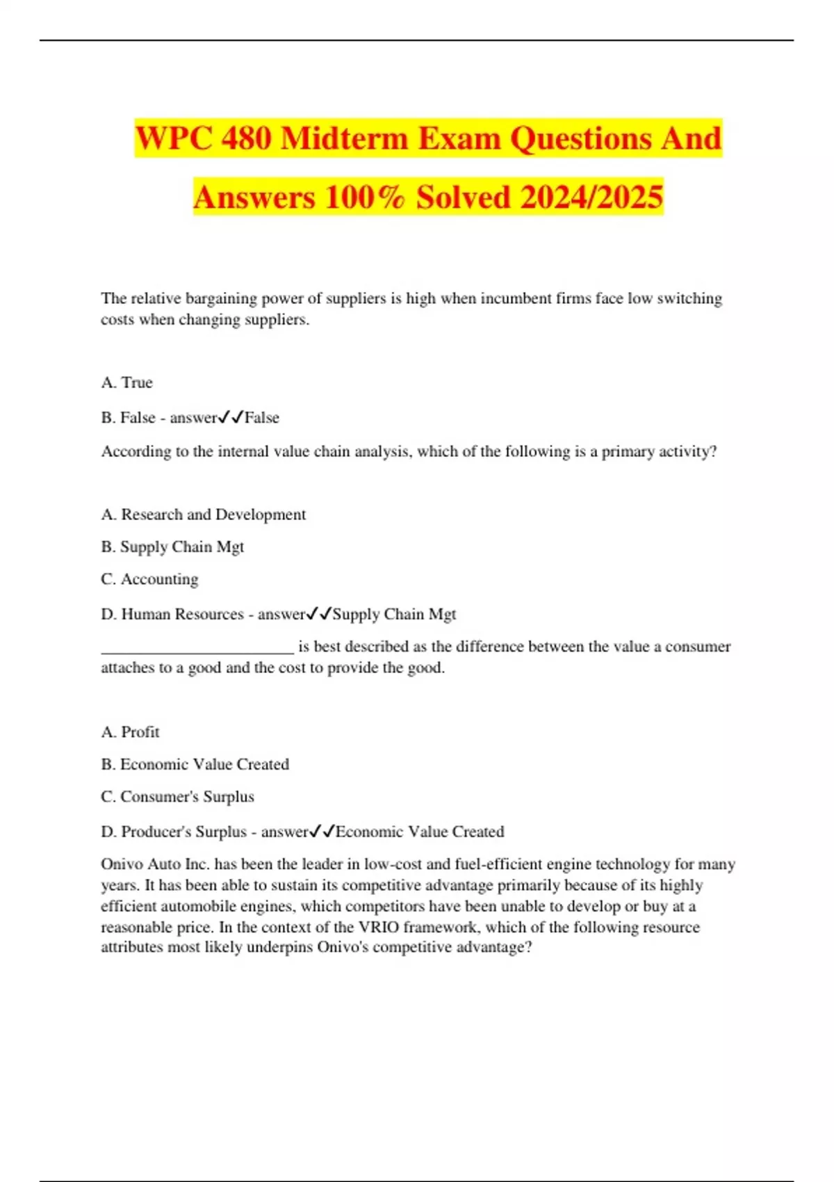 WPC 480 Midterm Exam Questions And Answers 100% Solved 2024/2025 The relative bargaining power of suppliers is high when incumbent firms face low switching costs when changing suppliers. A. True B. False - answerFalse According to the internal value chain analysis, which of the following is a primary activity? A. Research and Development B. Supply Chain Mgt C. Accounting D. Human Resources - answerSupply Chain Mgt _______________________ is best described as the difference between the value a consumer attaches to a good and the cost to provide the good. A. Profit B. Economic Value Created C. Consumer's Surplus D. Producer's Surplus - answerEconomic Value Created Onivo Auto Inc. has been the leader in low-cost and fuel-efficient engine technology for many years. It has been able to sustain its competitive advantage primarily because of its highly efficient automobile engines, which competitors have been unable to develop or buy at a reasonable price. In the context of the VRIO framework, which of the following resource attributes most likely underpins Onivo's competitive advantage? A. The resource is easy to replicate. B. The resource is costly to imitate. C. The resource neutralizes external opportunities - answerThe resource is costly to imitate. Which is a source of increasing customers' willingness to pay? A. Common Product Feature B. Learning Curve Effect C. Poor Customer Service D. Existence of Great Compliments - answerExistence of Great Compliments Which of the following is not true about the business-level strategy of Walmart? A. Walmart has been pursuing cost leadership strategy. B. Walmart charges lower price for national brand goods, increasing consumers' surplus. C. Heavy investment in smart IT systems is not consistent with Walmart's overall strategic position. D. Real-time EDI with suppliers helped Walmart lower inventory management cost. - answerHeavy investment in smart IT systems is not consistent with Walmart's overall strategic position What is strategy? - answerAn integrated set of goal-directed actions a firm takes to gain and sustain competitive advantages Competitive Advantage - answerOccurs when an organization is able to create more economic value than the marginal (breakeven) competitor in its product market (through superior differentiation and/or lower costs). [Temporary or Sustainable] Sustainable Competitive Advantage - answerOutperforming competitors or the industry average over a prolonged period of time Competitive Disadvantage - answerUnderperformance relative to other competitors in the same industry or the industry average Competitive Parity - answerPerformance of two or more firms at the same level Vision - answerWhat do we want to accomplish? Mission - answerHow do we accomplish our goals? What do we do to accomplish our goals? Values - answerWhat commitments do we make? What guardrails do we put in place? How can we act legally and ethically in pursuit of the vision and mission? Product-Oriented Vision Statement - answerDefines a business in terms of a good or service provided ex. "We aim to be the best player in the typewriter business" Cons: Less flexible, not needs-based Customer-Oriented Vision Statement - answerDefines a business in terms of providing solutions to customer needs Ex. Nike: "To bring inspiration and innovation to every athlete in the world" What's the difference between a mission and vision statement? - answerVision: What an org wants to accomplish Mission: How the vision will be accomplished Stakeholder Strategy - answerManaging stakeholders in order to gain and sustain competitive advantage Benefits of effective stakeholder strategy to firm performance - answerLowered costs, greater org adaptability and flexibility ex. Costco Stakeholders - answerAny person or groups who have a vested claim or interest in the performance and continued survival of the firm. What is Strategic Leadership? - answer-Successful use of power and influence -Directing the activities of others -Pursuing an organization's goals -Enabling organizational competitive advantage Intended Strategy - answerThe outcome of a rational and structured top-down strategic plan