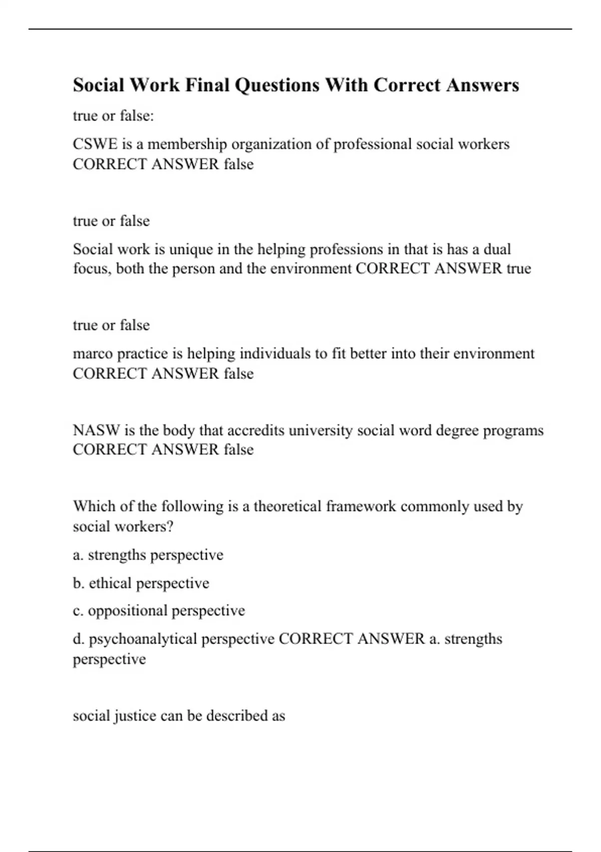 social work final questions with correct answers
