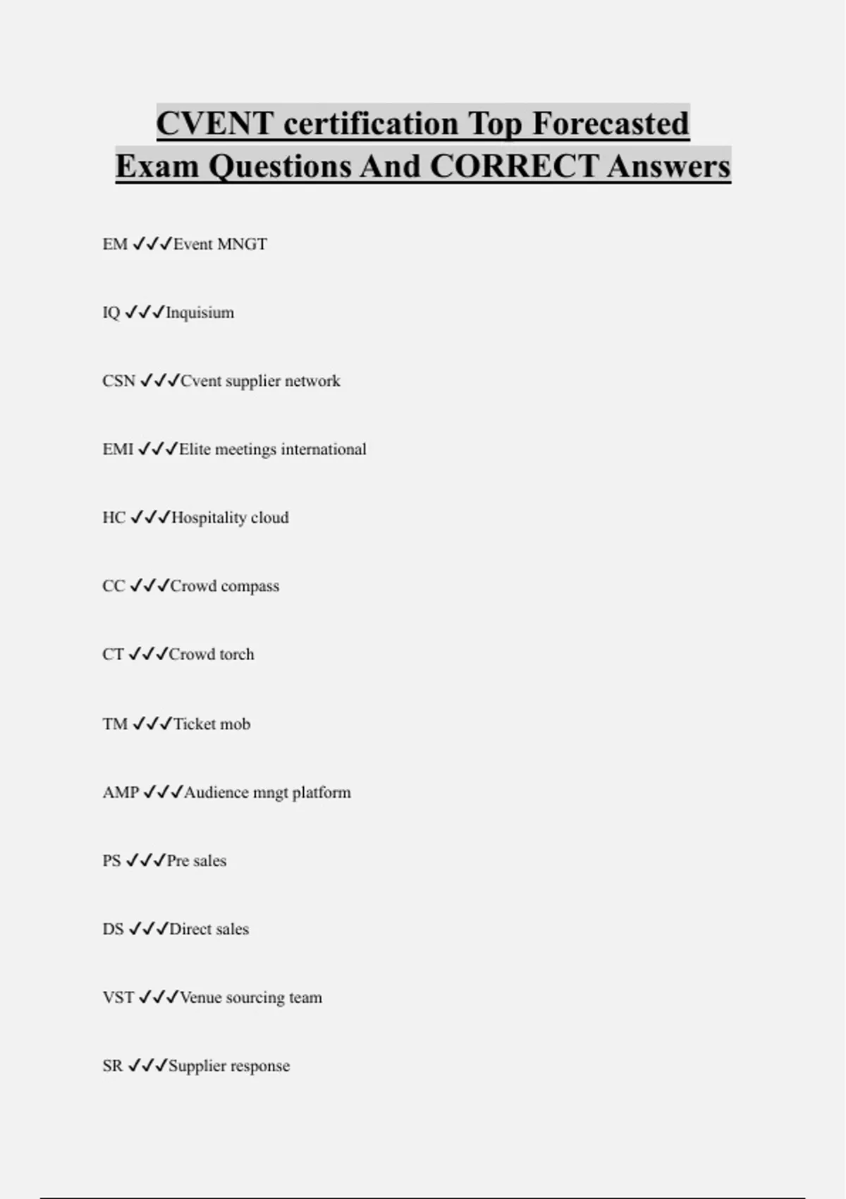 EM Event MNGT IQ Inquisium CSN Cvent supplier network EMI Elite meetings international HC Hospitality cloud CC Crowd compass CT Crowd torch TM Ticket mob