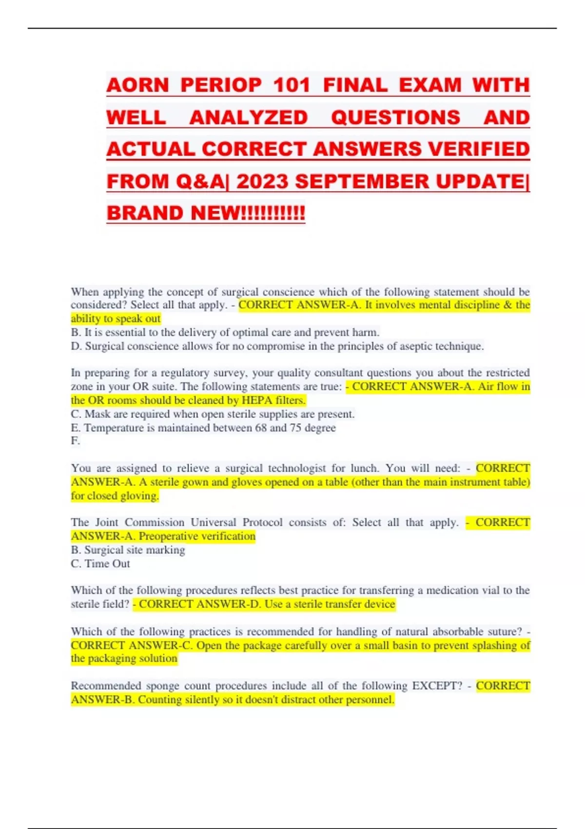 AORN PERIOP 101 FINAL EXAM WITH WELL ANALYZED QUESTIONS AND ACTUAL CORRECT ANSWERS VERIFIED FROM Q&A| 2023 SEPTEMBER UPDATE| BRAND NEW!!!!!!!!!!