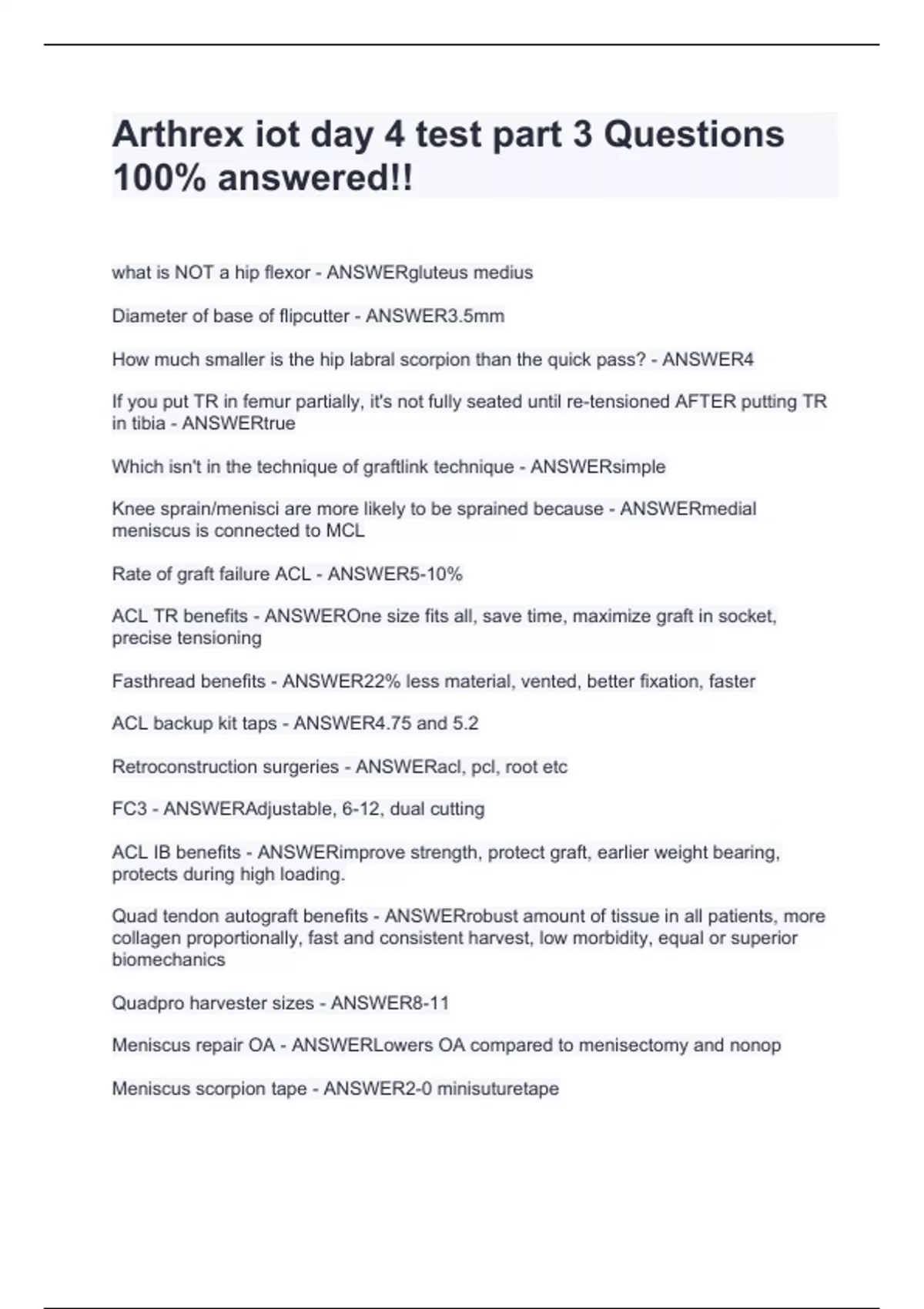 Arthrex iot day 4 test part 3 Questions 100% anwhat is NOT a hip flexor - ANSWERgluteus medius Diameter of base of flipcutter - ANSWER3.5mm How much smaller is the hip labral scorpion than the quick pass? - ANSWER4 If you put TR in femur partially, it's not fully seated until re-tensioned AFTER putting TR in tibia - ANSWERtrue Which isn't in the technique of graftlink technique - ANSWERsimple Knee sprain/menisci are more likely to be sprained because - ANSWERmedial meniscus is connected to MCL Rate of graft failure ACL - ANSWER5-10% ACL TR benefits - ANSWEROne size fits all, save time, maximize graft in socket, precise tensioning Fasthread benefits - ANSWER22% less material, vented, better fixation, faster swered!!