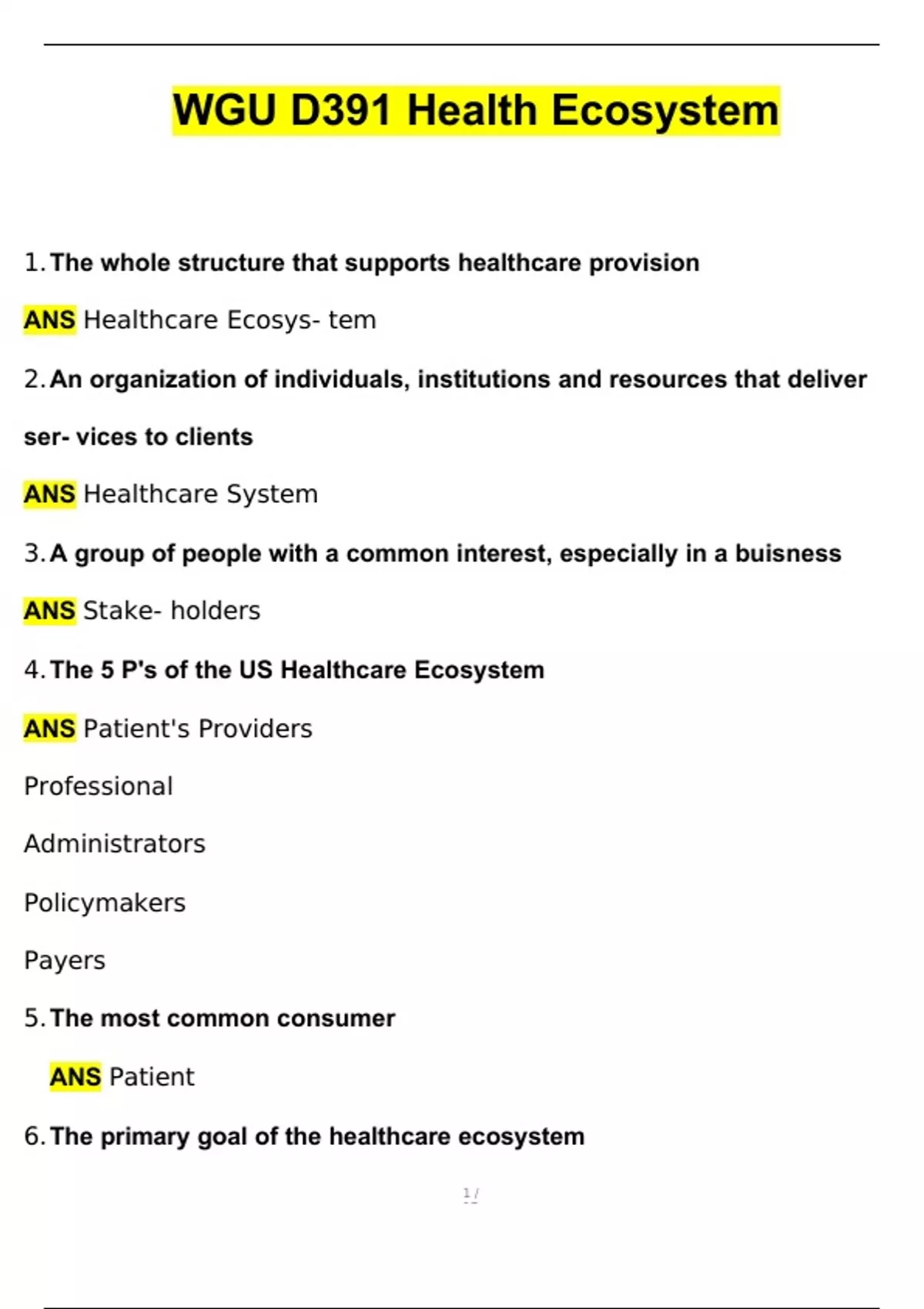 1. The whole structure that supports healthcare provision ANS Healthcare Ecosys- tem 2. An organization of individuals, institutions and resources that deliver ser- vices to clients ANS Healthcare System 3. A group of people with a common interest, especially in a buisness ANS Stake- holders 4. The 5 P's of the US Healthcare Ecosystem ANS Patient's Providers Professional Administrators Policymakers Payers 5. The most common consumer ANS Patient 6. The primary goal of the healthcare ecosystem ANS To raise the standard of health- care offered to members. 7. What are the fundamental components of a healthcare system? ANS Organiza- tion, funding, and delivery