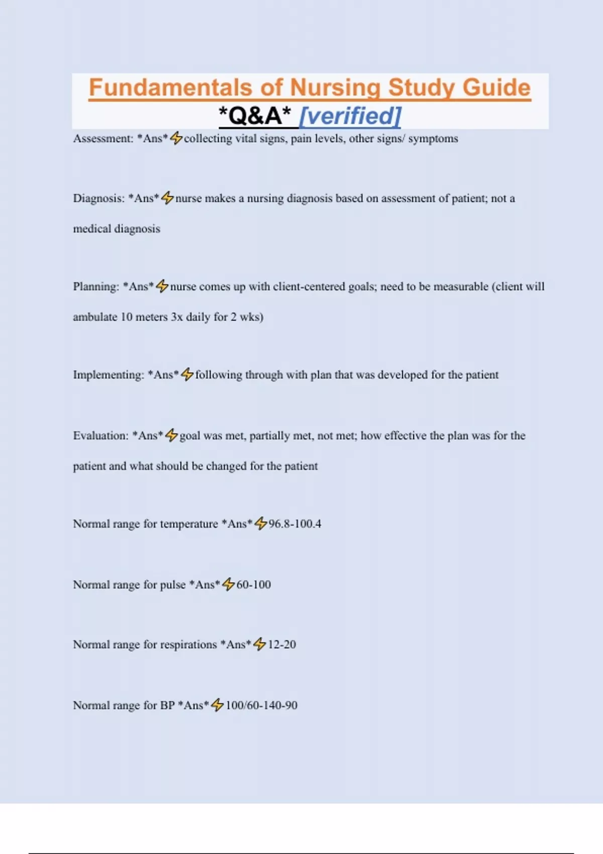Fundamentals of Nursing Study Guide *Q&A* [verified] Assessment: *Ans* collecting vital signs, pain levels, other signs/ symptoms Diagnosis: *Ans* nurse makes a nursing diagnosis based on assessment of patient; not a medical diagnosis Planning: *Ans* nurse comes up with client-centered goals; need to be measurable (client will ambulate 10 meters 3x daily for 2 wks) Implementing: *Ans* following through with plan that was developed for the patient Evaluation: *Ans* goal was met, partially met, not met; how effective the plan was for the patient and what should be changed for the patient Normal range for temperature *Ans* 96.8-100.4 Normal range for pulse *Ans* 60-100 Normal range for respirations *Ans* 12-20 Normal range for BP *Ans* 100/60-140-90 Normal range for pulse ox. *Ans* >95% SOLER *Ans* sit close, observe, lean forward, eye contact, relax Types of pain *Ans* acute, chronic, cancer, by inferred pathology, idiopathic Pain threshold *Ans* level of stimulus needed to produce the perception of pain Pain tolerance *Ans* amount of pain a patient endures without its interference of ADLs Factors influencing pain *Ans* age, fatigue, genes, neurological functions, social factors, spiritual factors, psychological factors, cultural factors Behavioral responses to pain *Ans* clenching teeth, holding painful part, bent posture, grimaces, cries or moans, restlessness, frequent requests of the nurse; confused patient may not show reaction Pharmacological pain relief *Ans* analgesics (NSAIDS & non-opioids, opioids, adjuvants