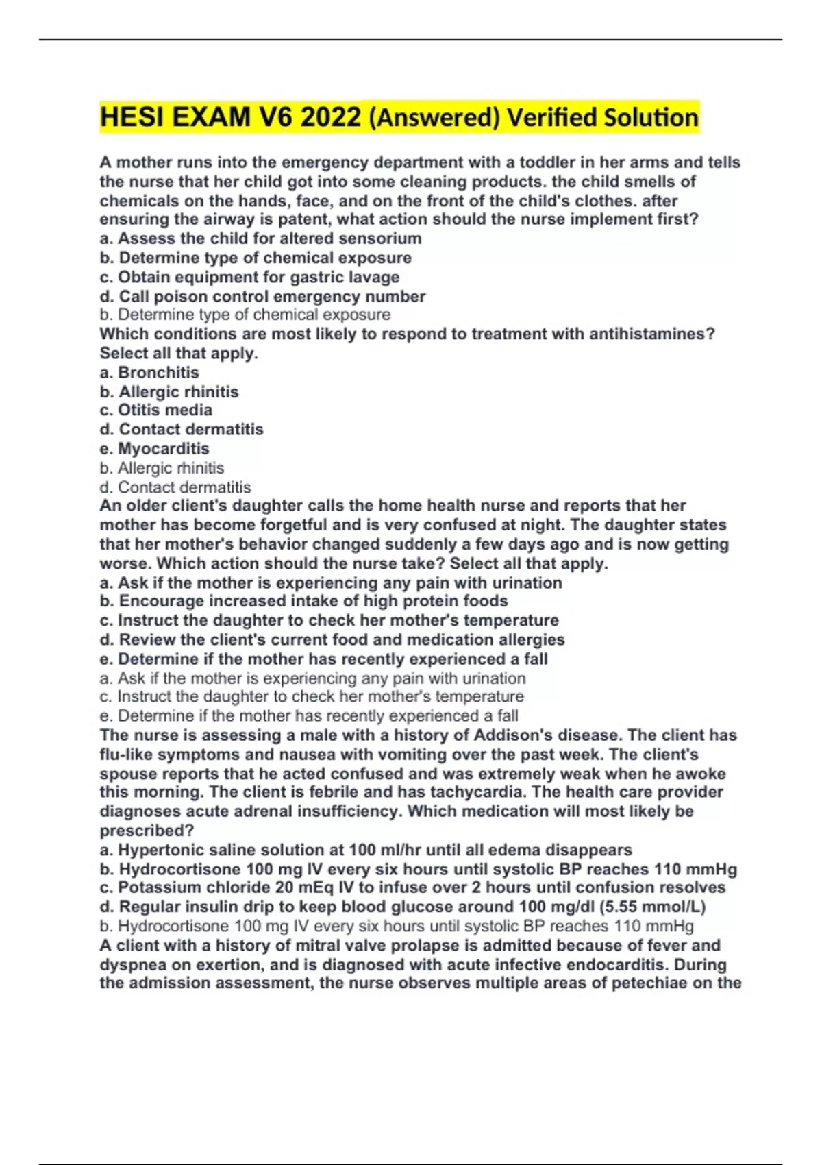 HESI EXAM V6 2022 (Answered) Verified Solution