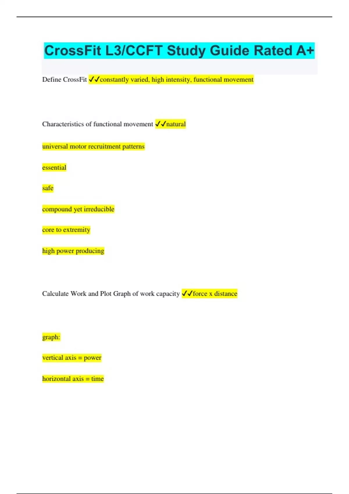 CrossFit L3/CCFT Study Guide Rated A+ Define CrossFit constantly varied, high intensity, functional movement Characteristics of functional movement natural universal motor recruitment patterns essential safe compound yet irreducible core to extremity high power producing Calculate Work and Plot Graph of work capacity force x distance graph: vertical axis = power horizontal axis = time