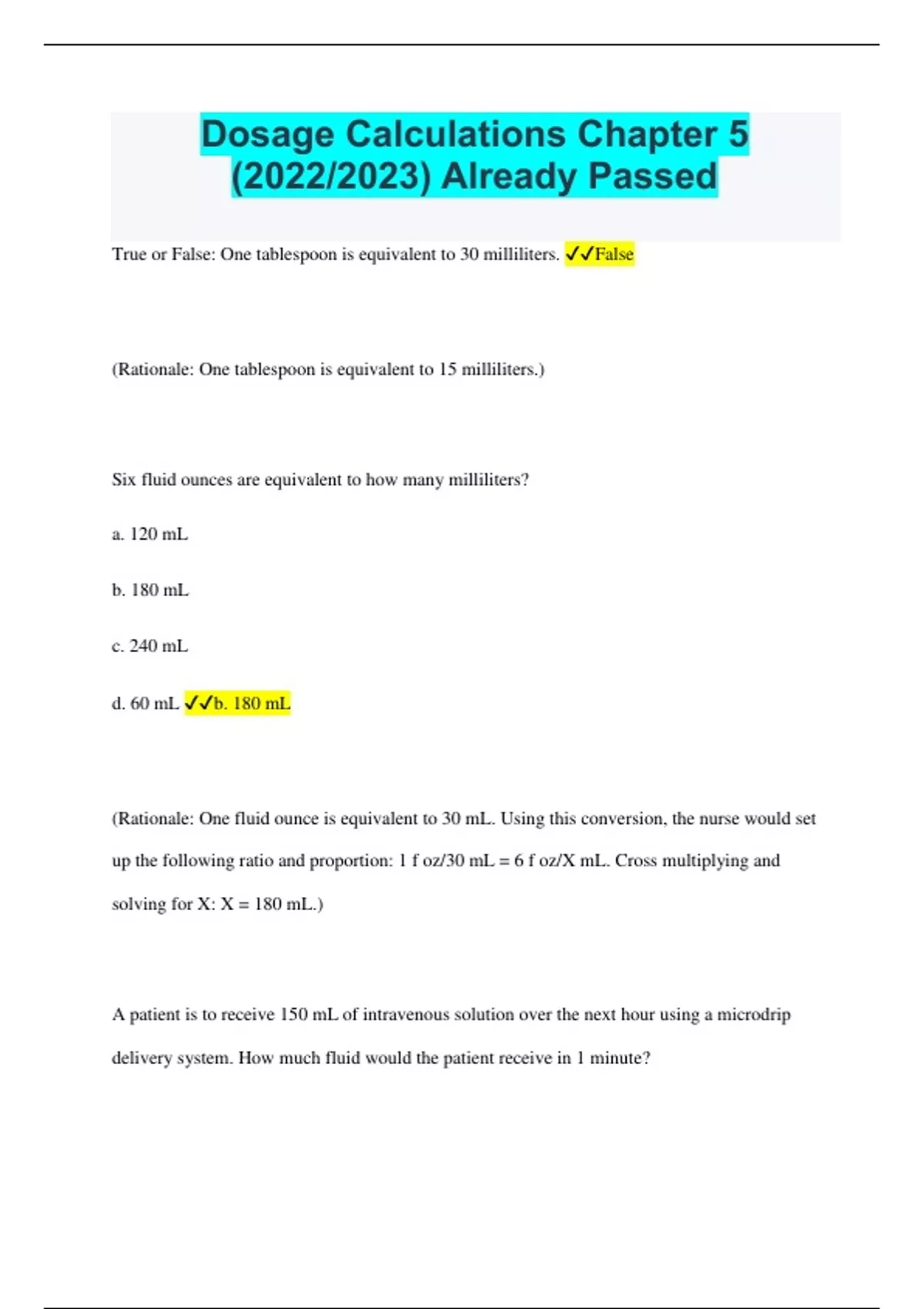 Dosage Calculations Chapter 5 (2022/2023) Already Passed True or False: One tablespoon is equivalent to 30 milliliters. False (Rationale: One tablespoon is equivalent to 15 milliliters.) Six fluid ounces are equivalent to how many milliliters? a. 120 mL b. 180 mL c. 240 mL d. 60 mL b. 180 mL (Rationale: One fluid ounce is equivalent to 30 mL. Using this conversion, the nurse would set up the following ratio and proportion: 1 f oz/30 mL = 6 f oz/X mL. Cross multiplying and solving for X: X = 180 mL.) A patient is to receive 150 mL of intravenous solution over the next hour using a microdrip delivery system. How much fluid would the patient receive in 1 minute?