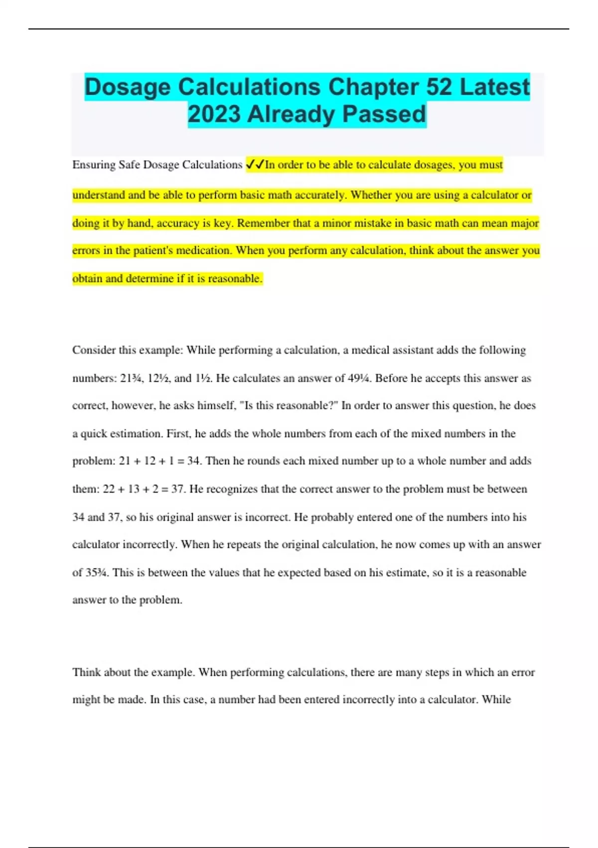 Dosage Calculations Chapter 52 Latest 2023 Already Passed Ensuring Safe Dosage Calculations In order to be able to calculate dosages, you must understand and be able to perform basic math accurately. Whether you are using a calculator or doing it by hand, accuracy is key. Remember that a minor mistake in basic math can mean major errors in the patient's medication. When you perform any calculation, think about the answer you obtain and determine if it is reasonable. Consider this example: While performing a calculation, a medical assistant adds the following numbers: 21¾, 12½, and 1½. He calculates an answer of 49¼. Before he accepts this answer as correct, however, he asks himself, "Is this reasonable?" In order to answer this question, he does a quick estimation. First, he adds the whole numbers from each of the mixed numbers in the problem: 21 + 12 + 1 = 34. Then he rounds each mixed number up to a whole number and adds them: 22 + 13 + 2 = 37. He recognizes that the correct answer to the problem must be between 34 and 37, so his original answer is incorrect. He probably entered one of the numbers into his calculator incorrectly. When he repeats the original calculation, he now comes up with an answer of 35¾. This is between the values that he expected based on his estimate, so it is a reasonable answer to the problem. Think about the example. When performing calculations, there are many steps in which an error might be made. In this case, a number had been entered incorrectly into a calculator. While