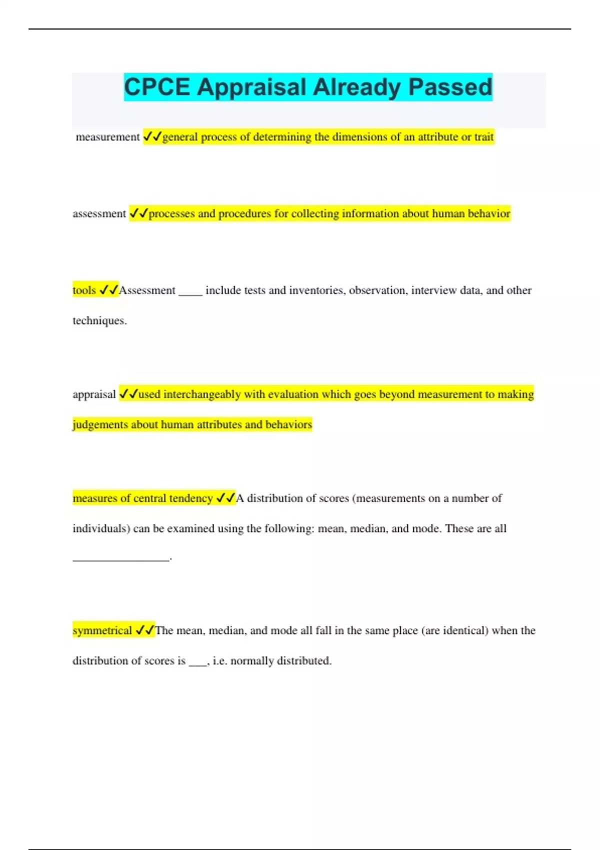 CPCE Appraisal Already Passed measurement general process of determining the dimensions of an attribute or trait assessment processes and procedures for collecting information about human behavior tools Assessment ____ include tests and inventories, observation, interview data, and other techniques. appraisal used interchangeably with evaluation which goes beyond measurement to making judgements about human attributes and behaviors measures of central tendency A distribution of scores (measurements on a number of individuals) can be examined using the following: mean, median, and mode. These are all ________________. symmetrical The mean, median, and mode all fall in the same place (are identical) when the distribution of scores is ___, i.e. normally distributed