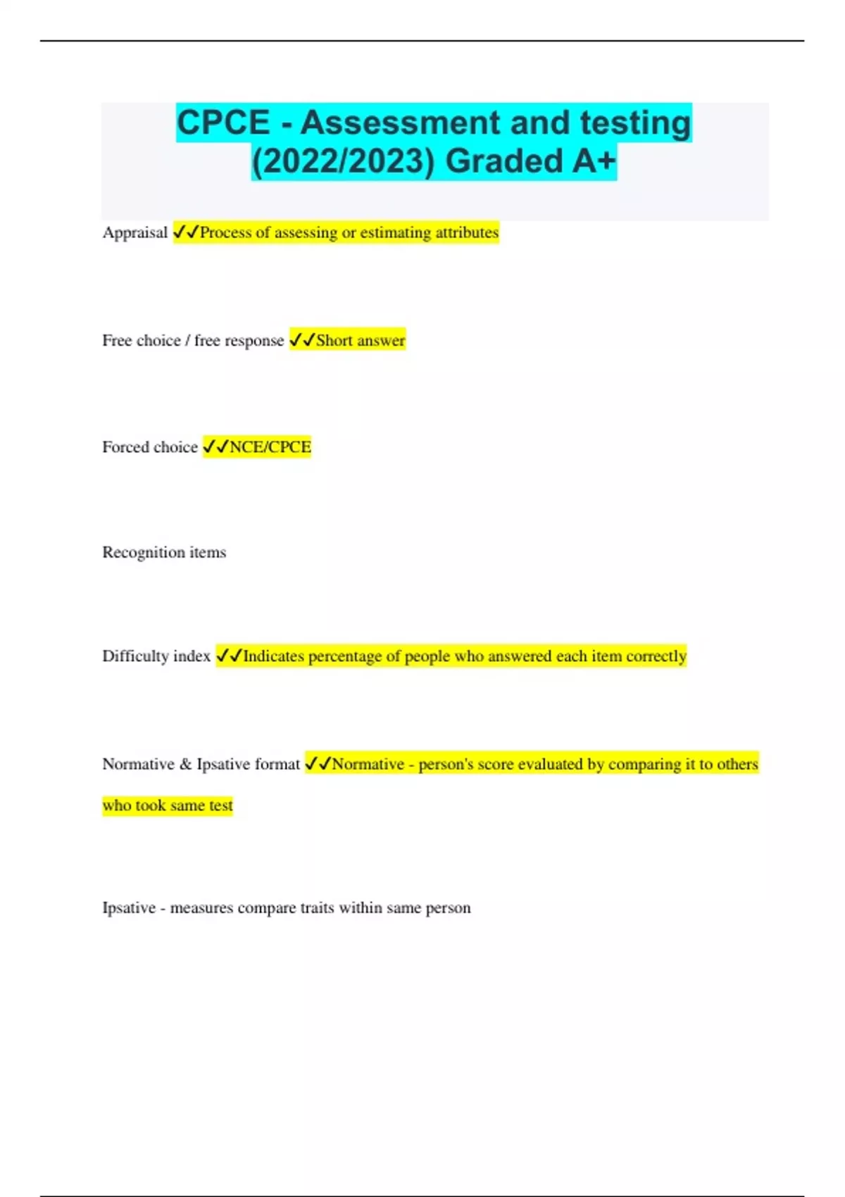 CPCE - Assessment and testing (2022/2023) Graded A+ Appraisal Process of assessing or estimating attributes Free choice / free response Short answer Forced choice NCE/CPCE Recognition items Difficulty index Indicates percentage of people who answered each item correctly Normative & Ipsative format Normative - person's score evaluated by comparing it to others who took same test Ipsative - measures compare traits within same person