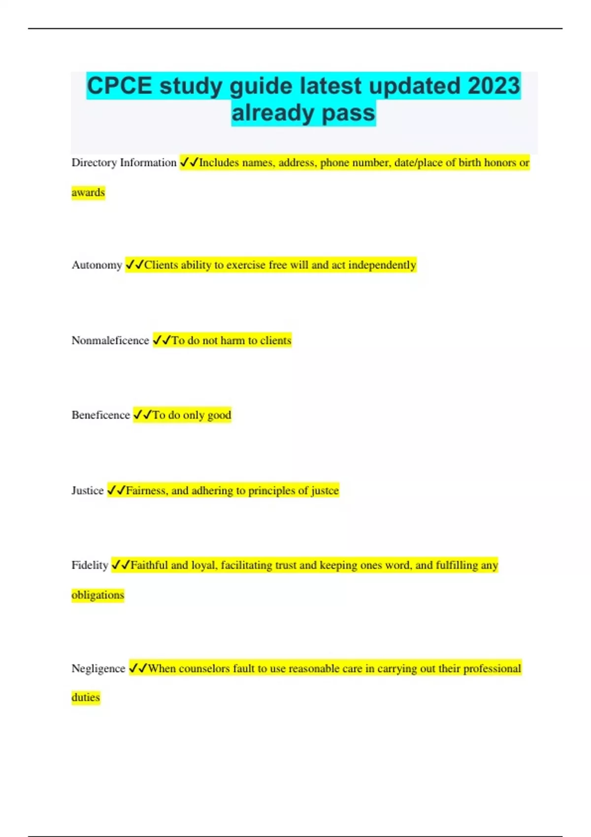CPCE study guide latest updated 2023 already passed Directory Information Includes names, address, phone number, date/place of birth honors or awards Autonomy Clients ability to exercise free will and act independently Nonmaleficence To do not harm to clients Beneficence To do only good Justice Fairness, and adhering to principles of justce Fidelity Faithful and loyal, facilitating trust and keeping ones word, and fulfilling any obligations